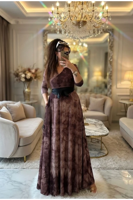 Tam Boy Kahve Dalga Desen Elbise