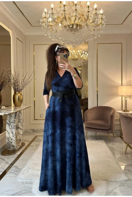 Tam Boy Lacivert Dalga Desen Elbise