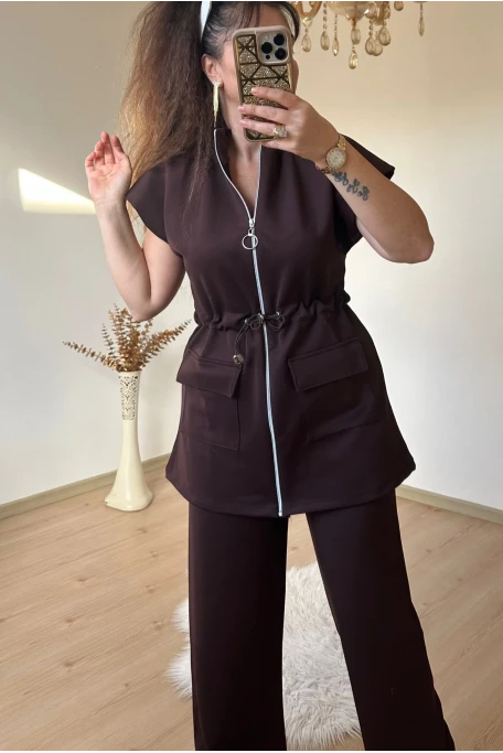 Dik Yaka Fermuarlı Yelekli Takım Kahve