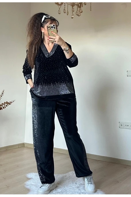 V YAka Taşlı Kadıfe Takım Siyah Büyük Beden