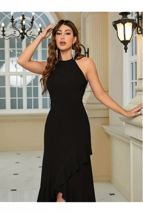 Halter Yaka Eteği Volanlı Krep Uzun Elbise Siyah