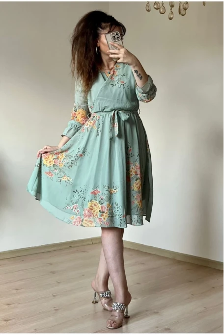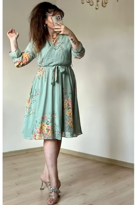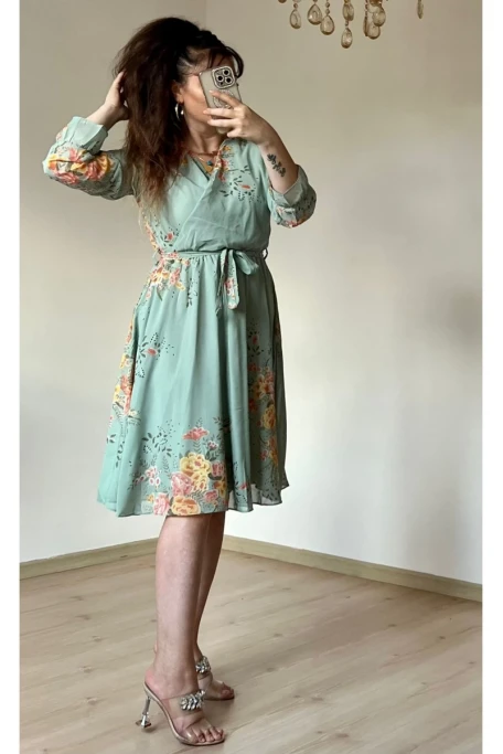 Zamansız parçaların yer almaya hazır olan elbise; bel kuşak ve bilek lastik detayları ile zarif bir stil oluşturuyor.Eteğindeki volanlar ile hareket kazan elbisenizi; zarif yüksek topuklu ayakkabılar ile tamamlayarak, şıklık gerektiren özel toplantı yada davetlerde kusursuz ve zarif bir görünümü yakalayabilirsiniz.               -Midi Boy               -Rahat Kesim               -Şifon Kumaş               -Kruvaze Yaka                  -Bel Kuşak Detay               -Astarlı Ürün ÖzellikleriKruvaze Şifon Kuşaklı ElbiseNumune Ürün Uzunluk: 105 cm (1-3 cm arası değişkenlik gösterebilir.)Numune Ürün Kol Uzunluk: 60 cm (1-3 cm arası değişkenlik gösterebilir.)Kumaş Türü: ŞifonModel ÖlçüleriBoy: 1.65 cmKilo: 53 kgModel Üst: S/36 Alt: S/36/27 beden giyiyor
