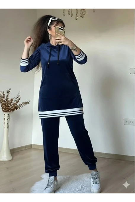 Beyaz Şeritli Kapusonlu Kadıfe Takım Lacivert