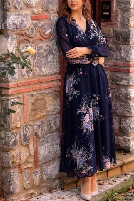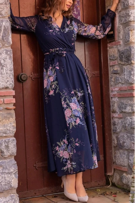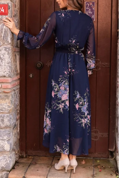 Çiçek Desen Şifon Midi ElbiseÜrünün uzunluğu 135 cm'dir. (1-3 cm arası değişiklik gösterebilir.)Ürünün kol uzunluğu 63 cm'dir. (1-3 cm arası değişiklik gösterebilir.)Modelin üzerindeki ürün XXL/44 bedendir.Modelin Ölçüleri: Boy: 1.79, Kilo: 79, Göğüs: 90, Bel: 89, Kalça: 115Kumaş Türü: ŞifonÜrün kuşaklı ve astarlı olarak tasarlanmıştır.