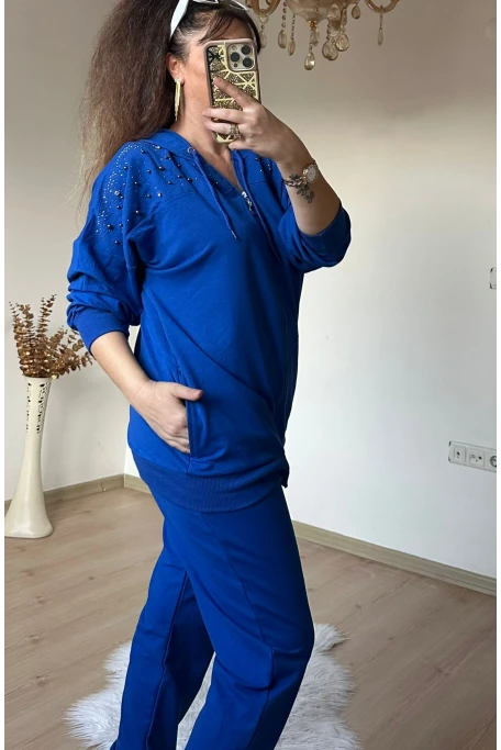 Beyaz Şeritli Kapusonlu Kadıfe Takım Lacivert