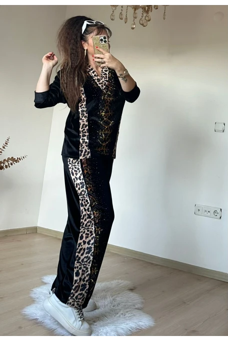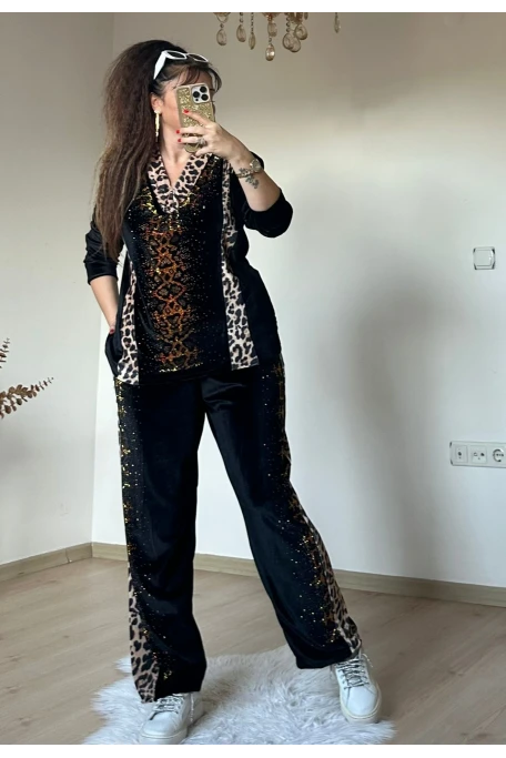 V YAka Leopar Taşlı Kadıfe Takım Büyük Beden