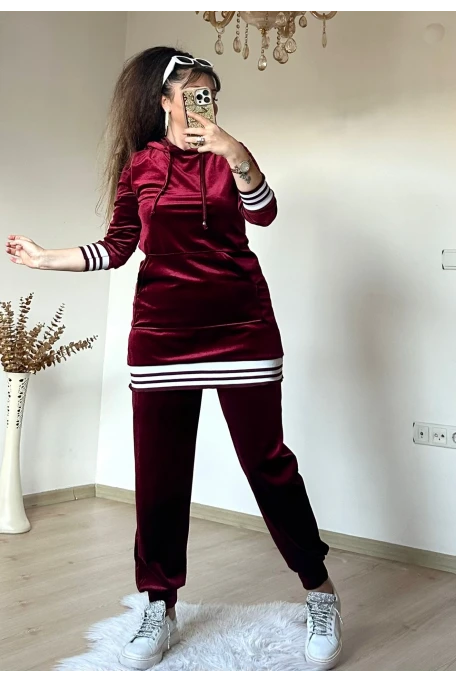 Beyaz Şeritli Kapusonlu Kadıfe Takım Bordo