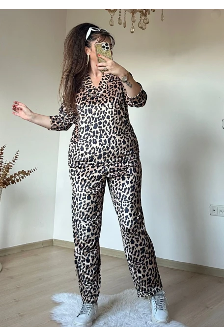 V Yaka Kadıfe Leopar Takım Büyük Beden