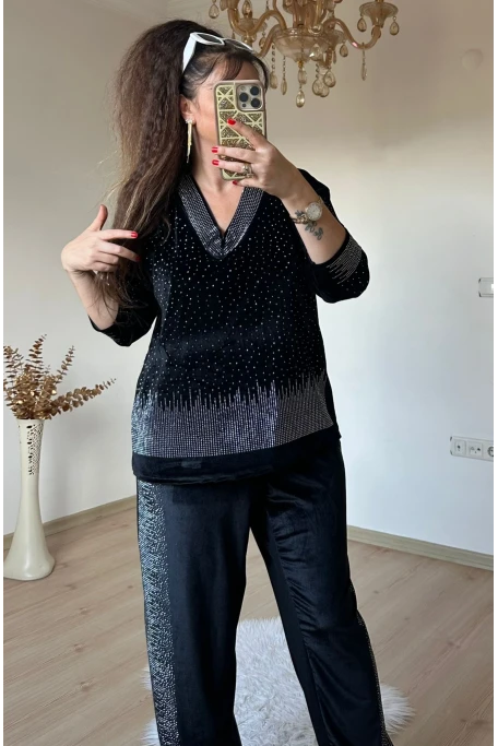 V YAka Taşlı Kadıfe Takım Siyah Büyük Beden