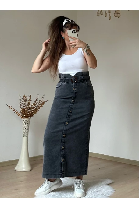 Bel Detaylı Dar Kot Etek Koyu Füme
