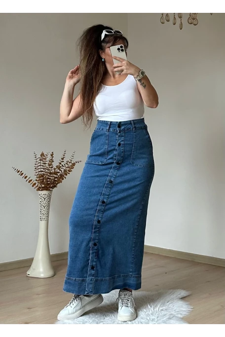 Bel Detaylı Dar Kot Etek Koyu Mavi