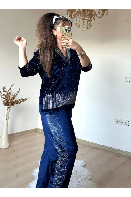 V YAka Taşlı Kadıfe Takım Lacivert Büyük Beden