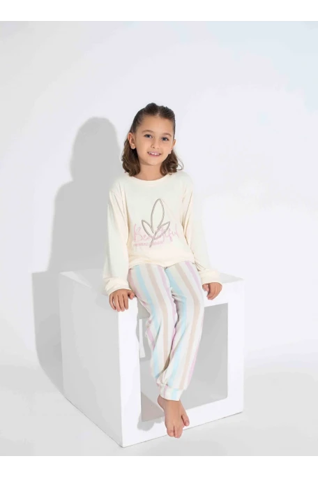 Ekru Çizgi Desen Çoçuk Pijama Takımı