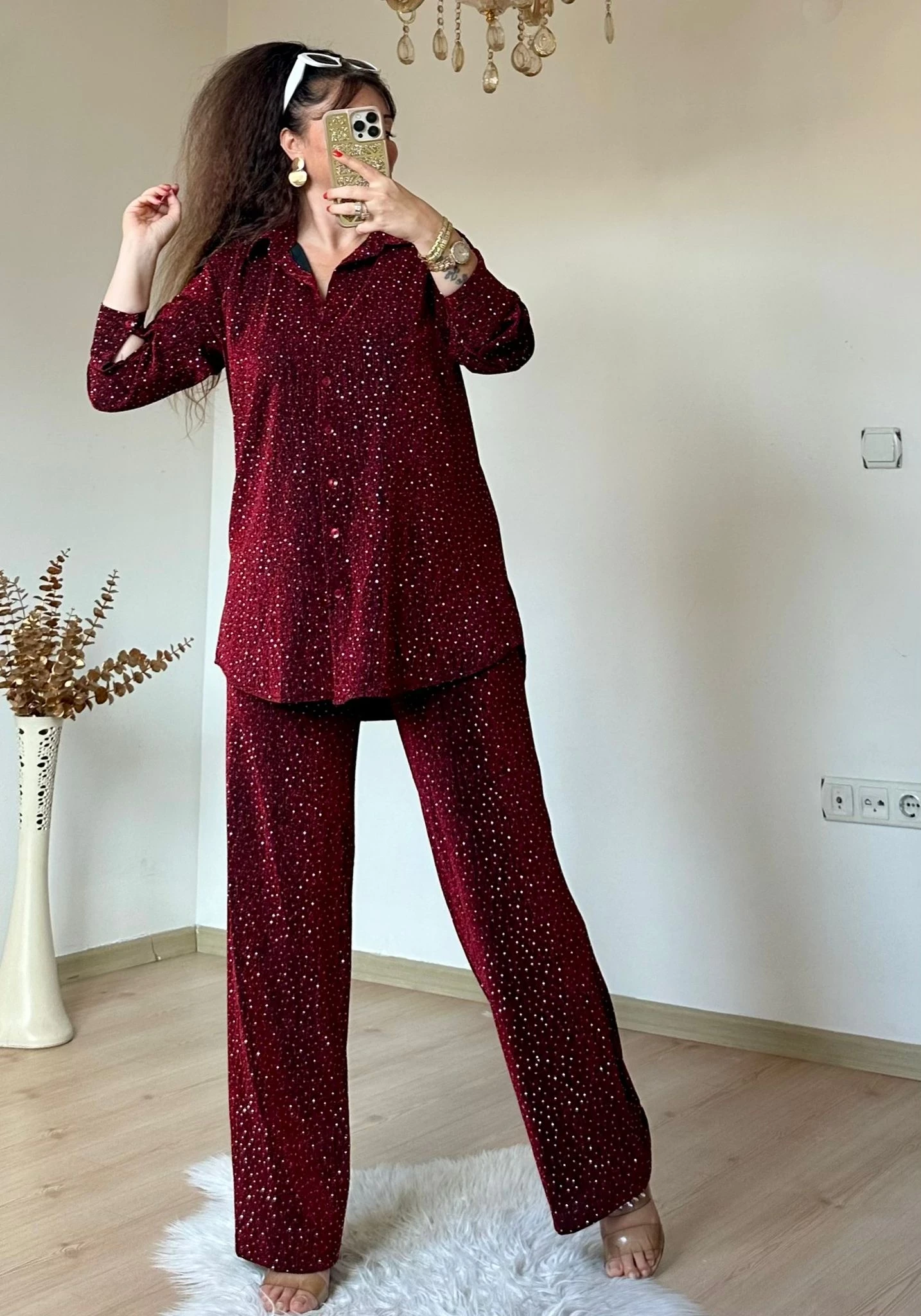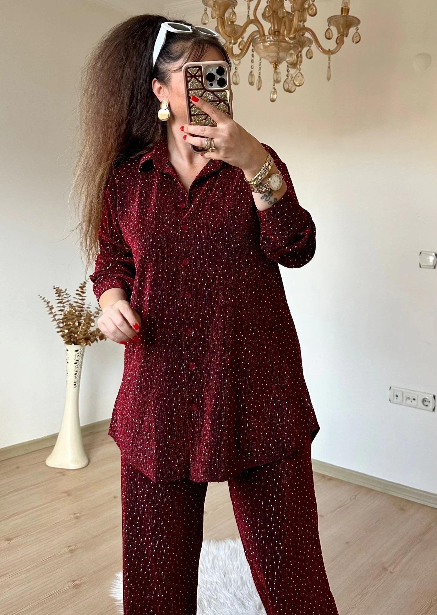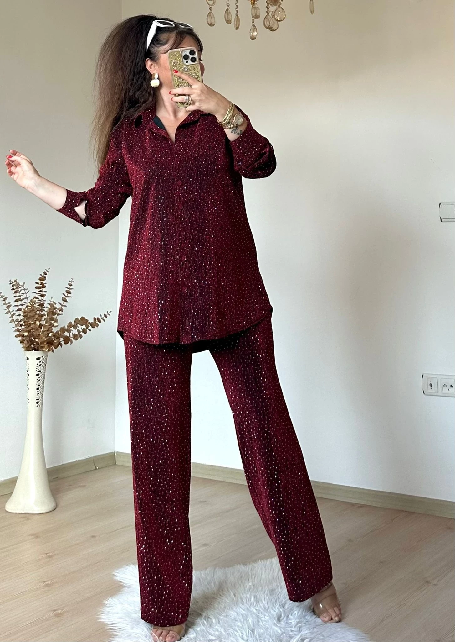 Işıltılı Gömlek Takım Bordo
