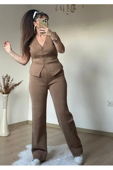 Dik Yaka Fermuarlı Yelekli Takım Kahve