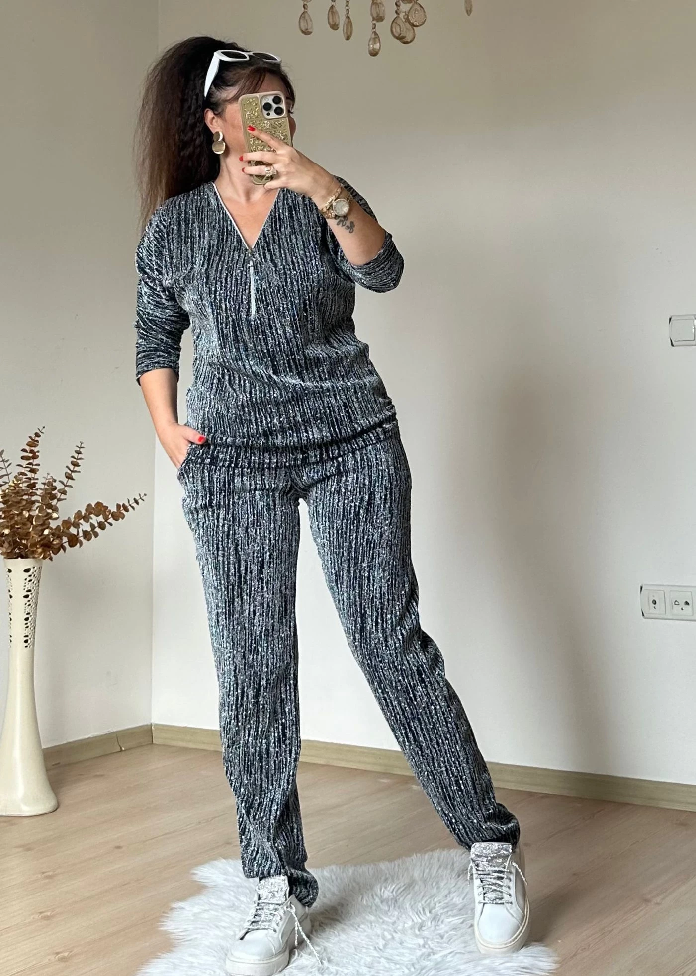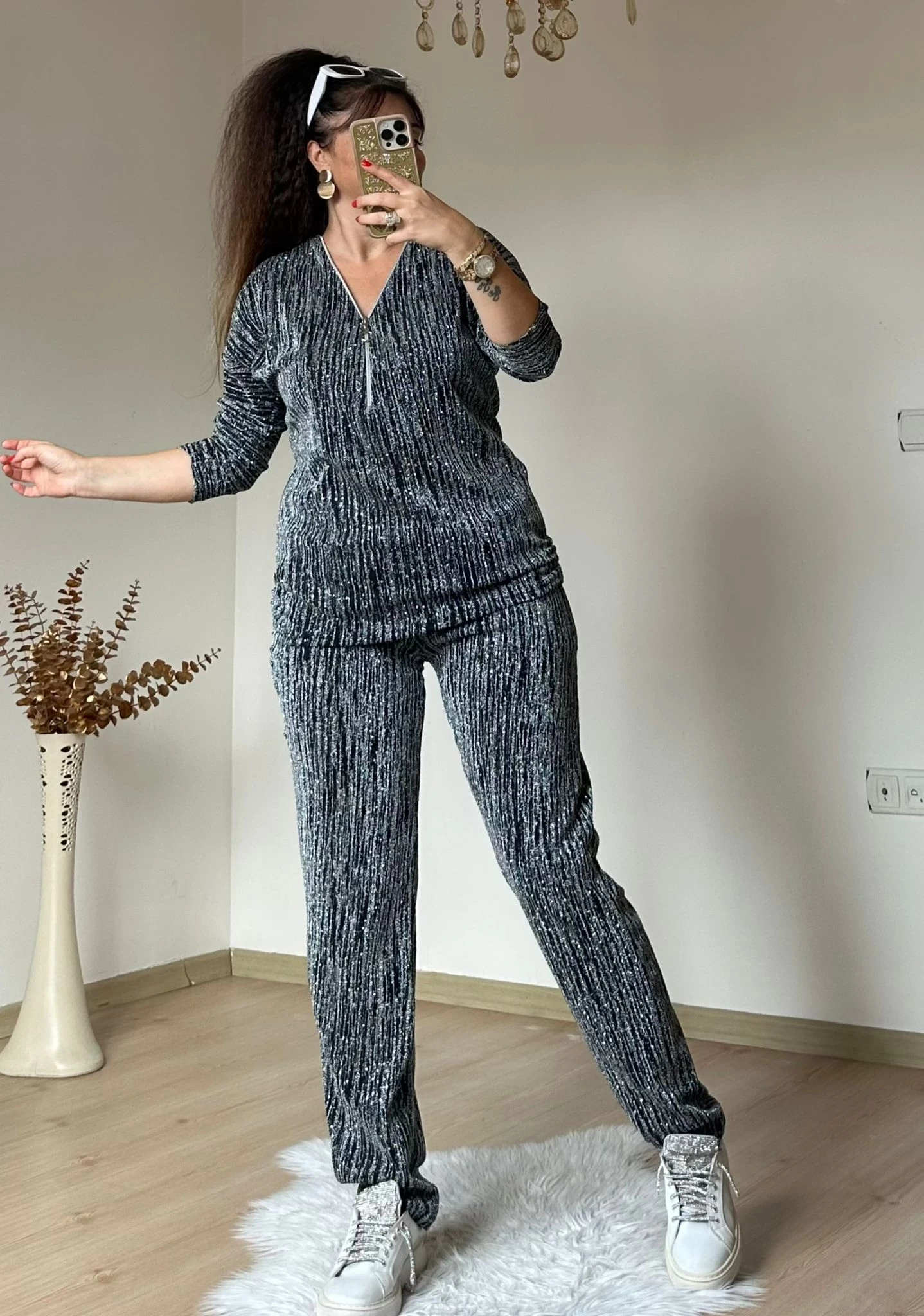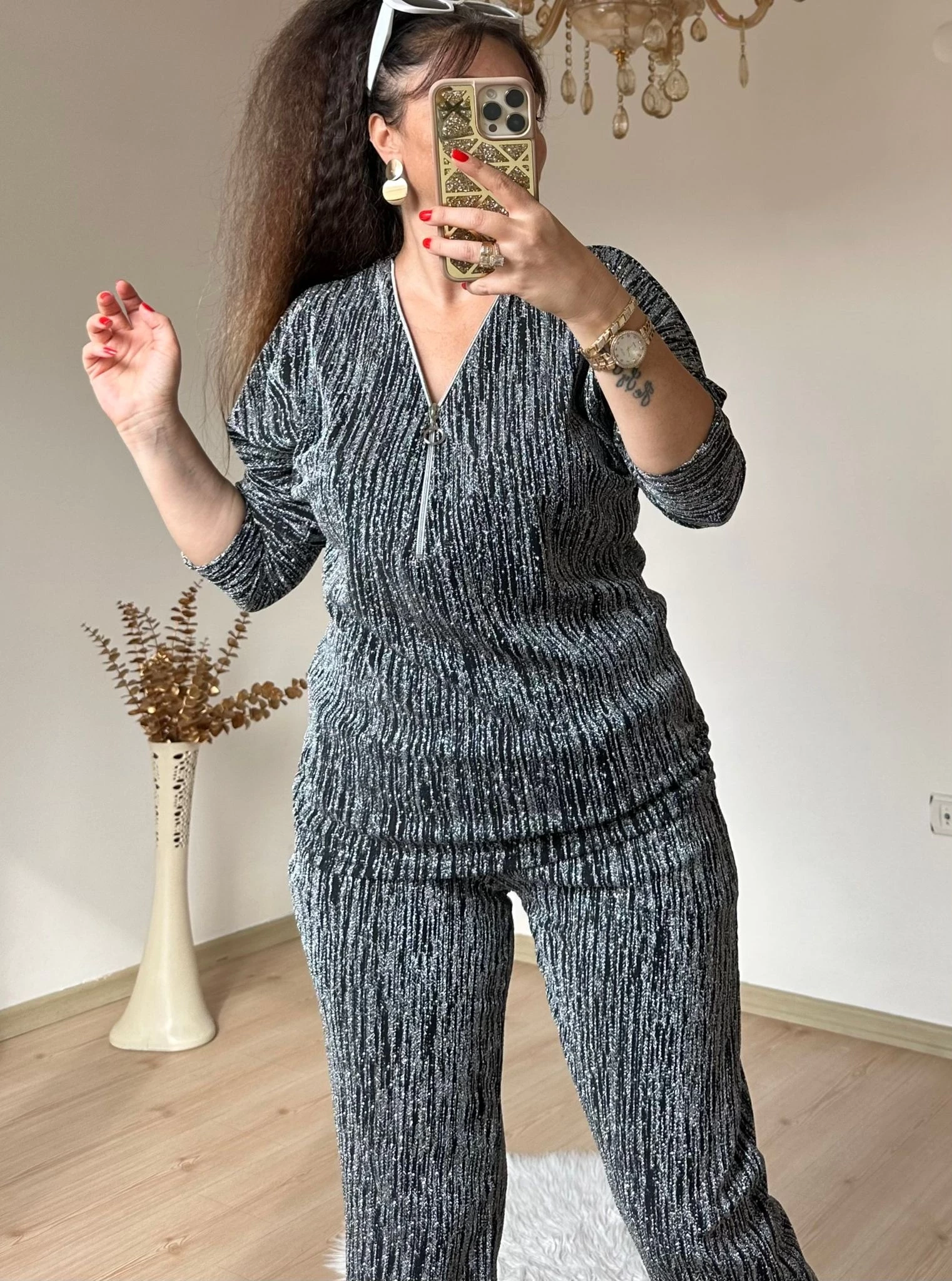 Yaka Taşlı Paça Detaylı Takım Siyah