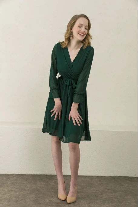 Zümrüt Yeşili Kruvaze Yaka Şifon Büyük Beden Kısa Elbise