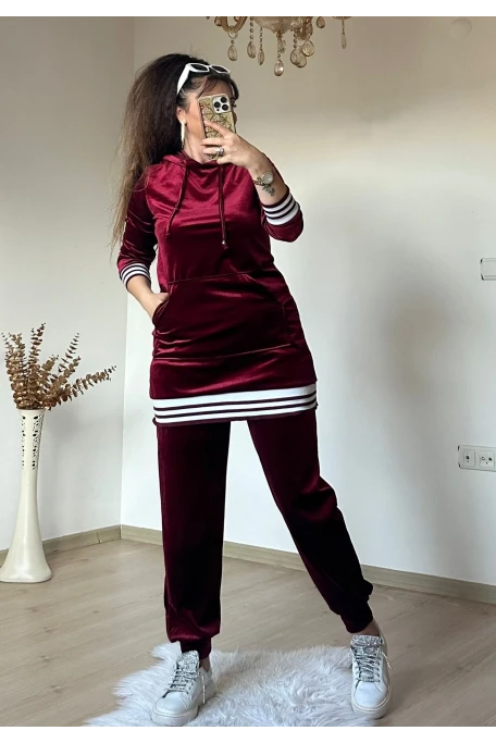Beyaz Şeritli Kapusonlu Kadıfe Takım Bordo