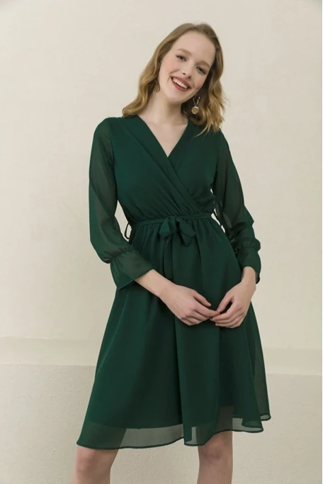 Zümrüt Yeşili Kruvaze Yaka Şifon Büyük Beden Kısa Elbise