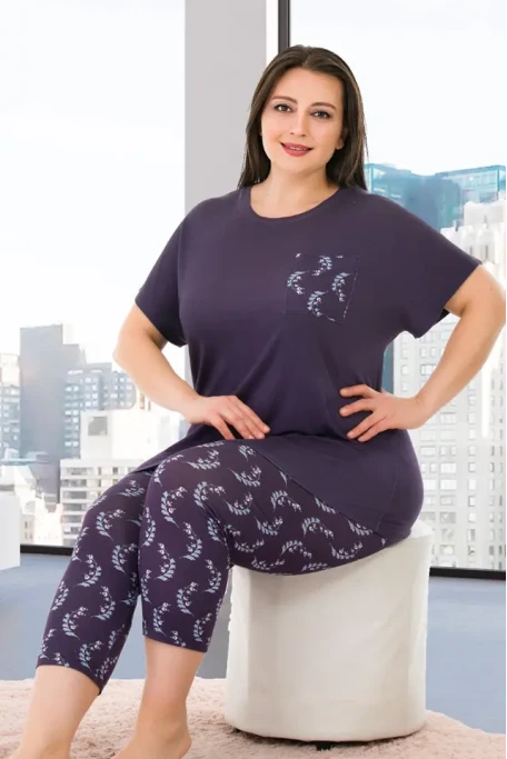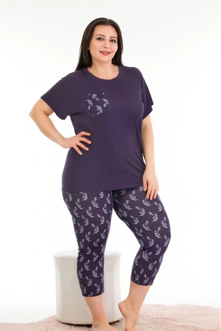 Büyük Beden Desenli Kısa Kol Viskon Kumaş Kapri Pijama Takımı