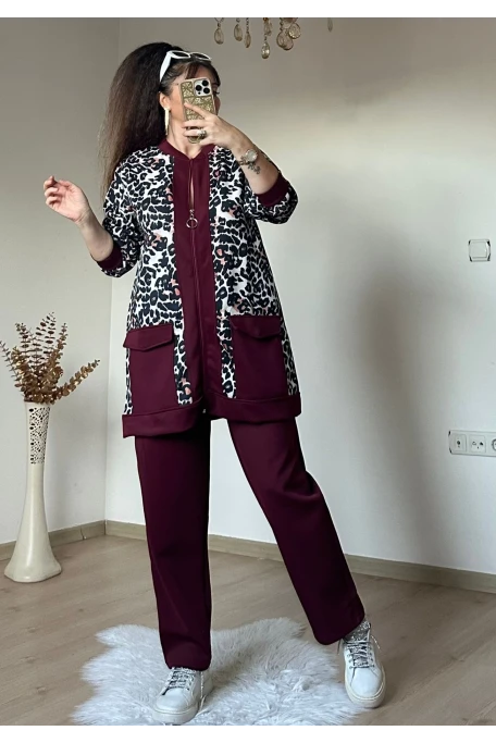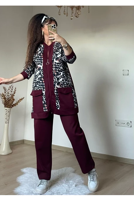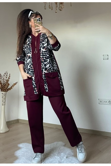 Fermuarlı Leopar Takım Bordo