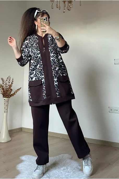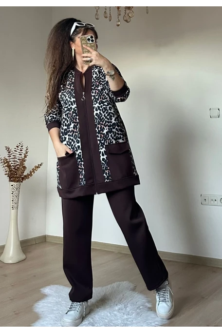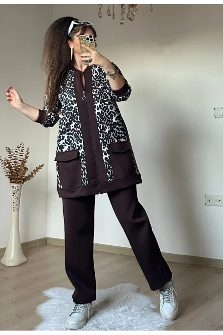 Fermuarlı Leopar Takım Kahve