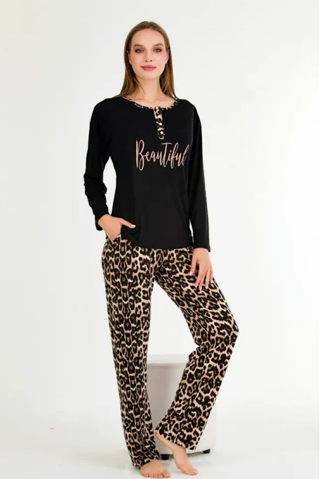 Uzun Kol Yaka Düğmeli Leopar Bayan Pijama Takımı