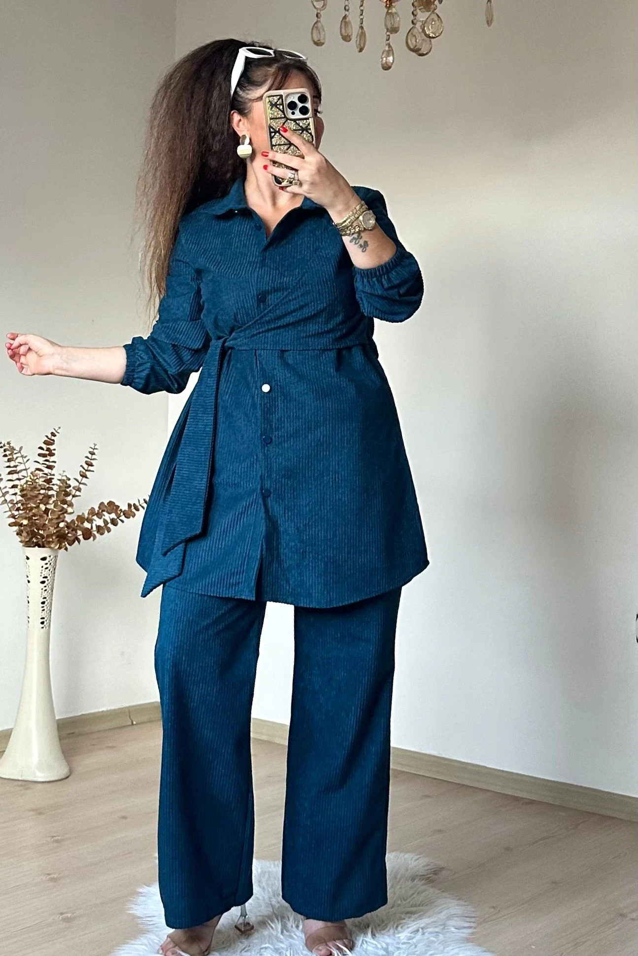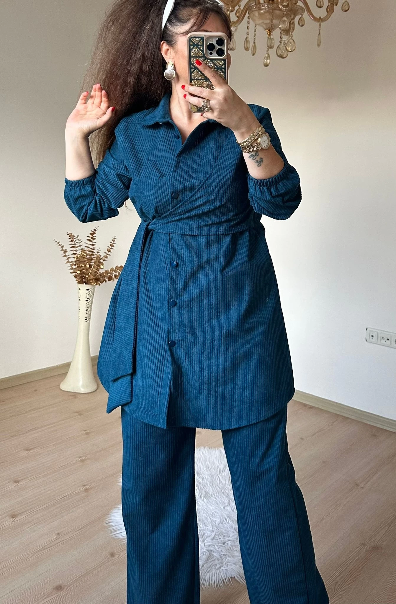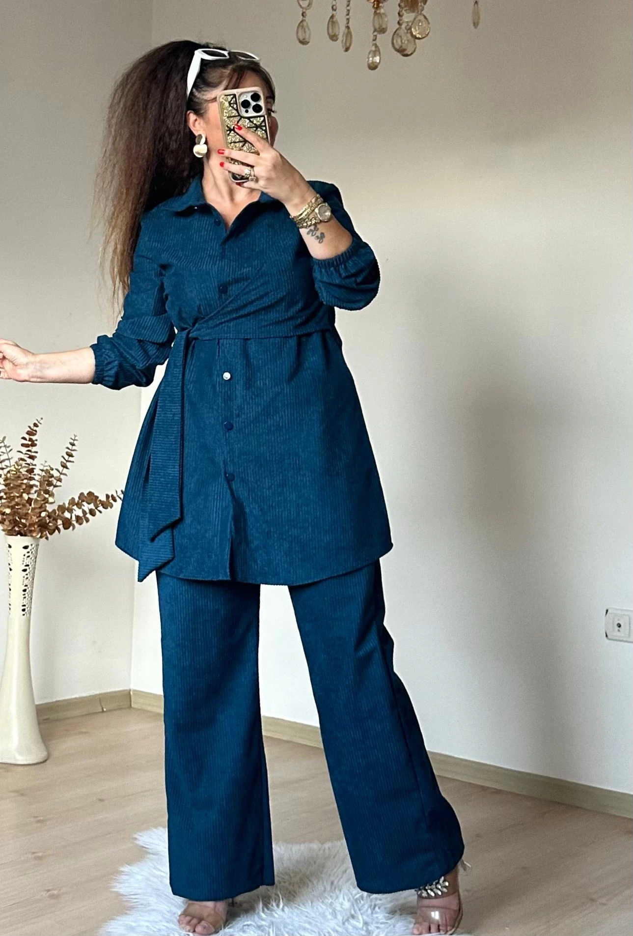Yan Bağlamalı Fitilli kadife Takım Mavi