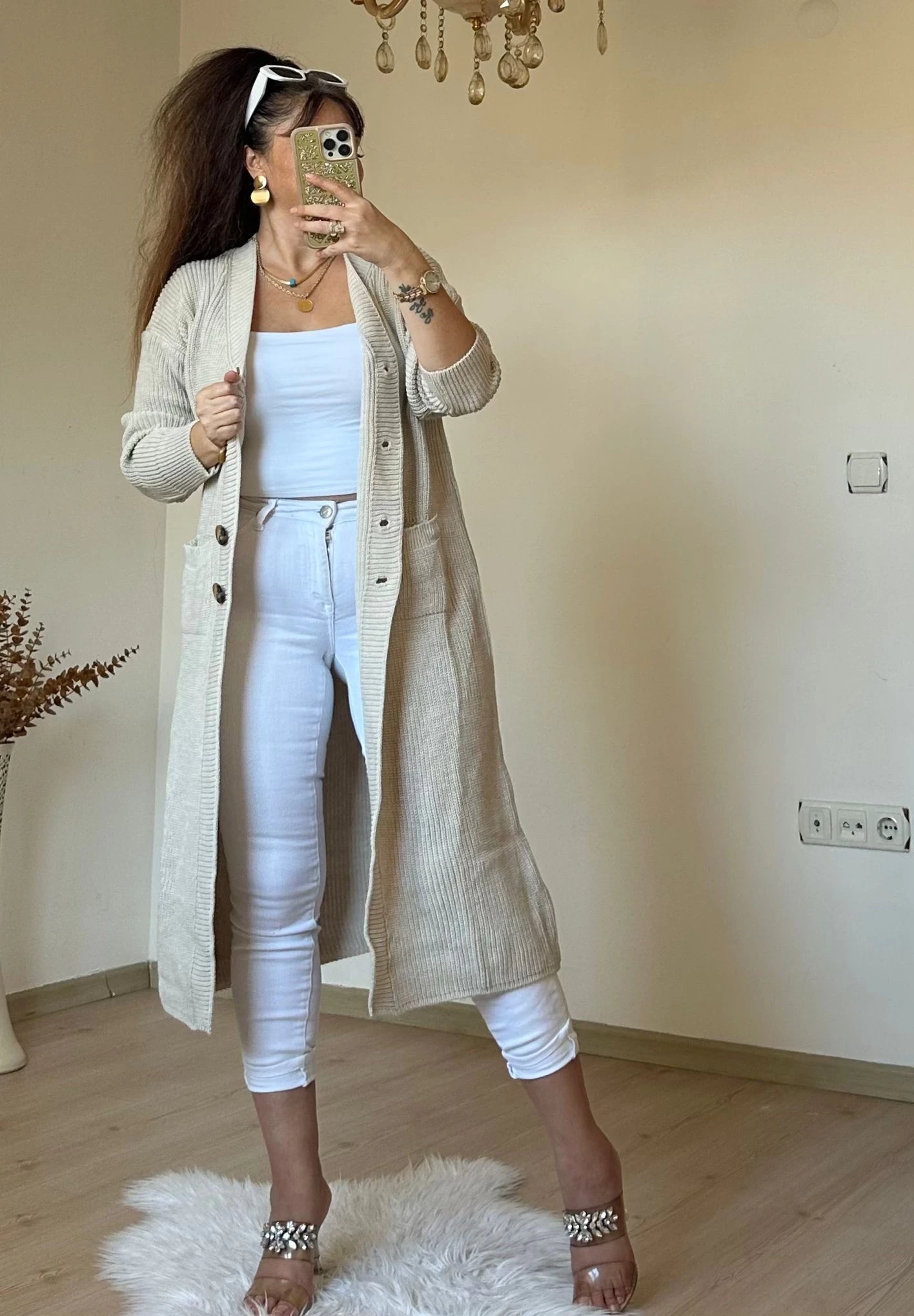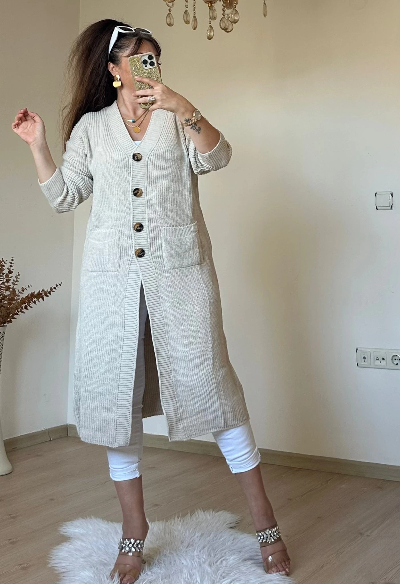 Düğmeli Uzun Hırka Bej