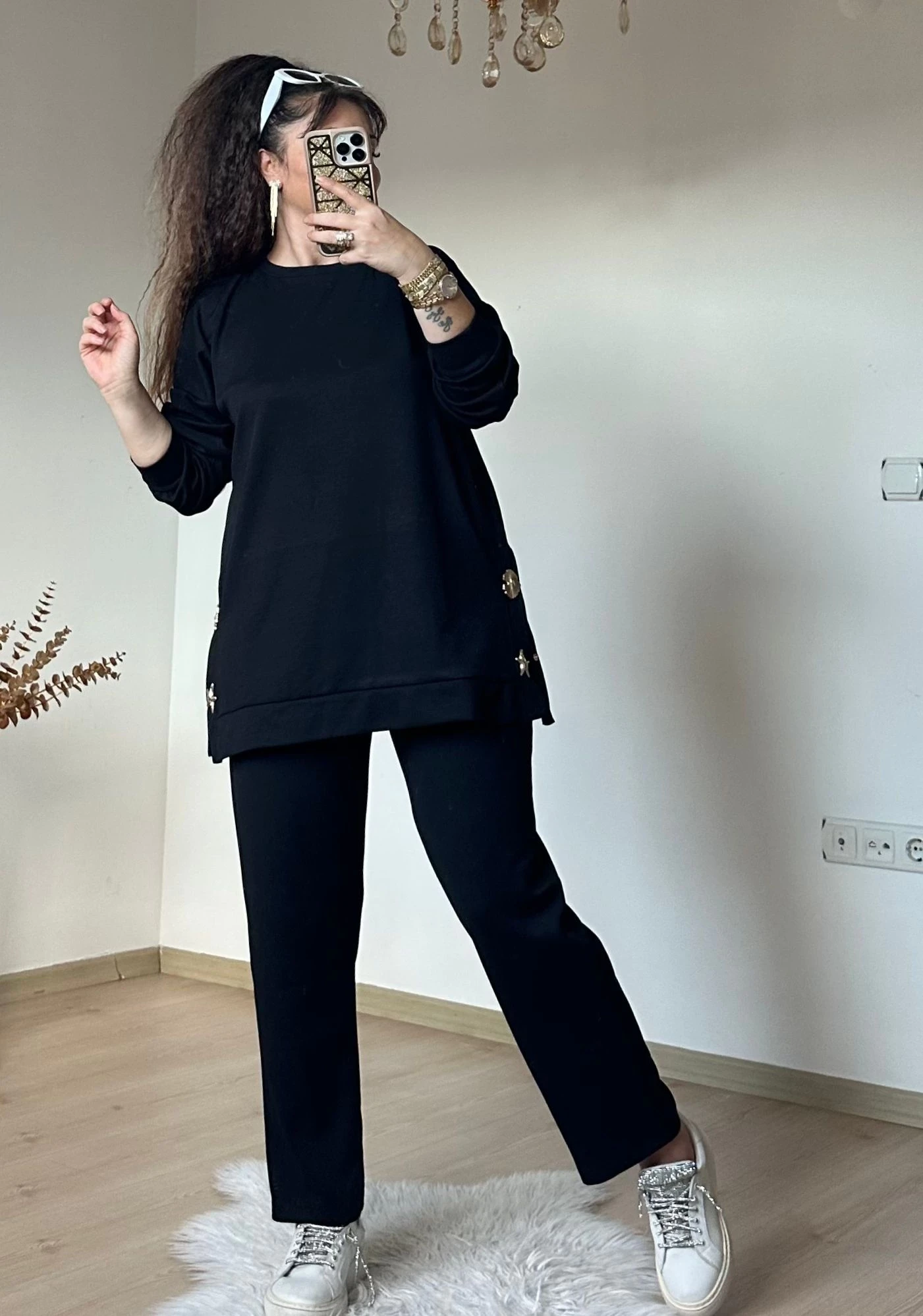 Uzun Kol Yan Çıtçıtlı Siyah Takım