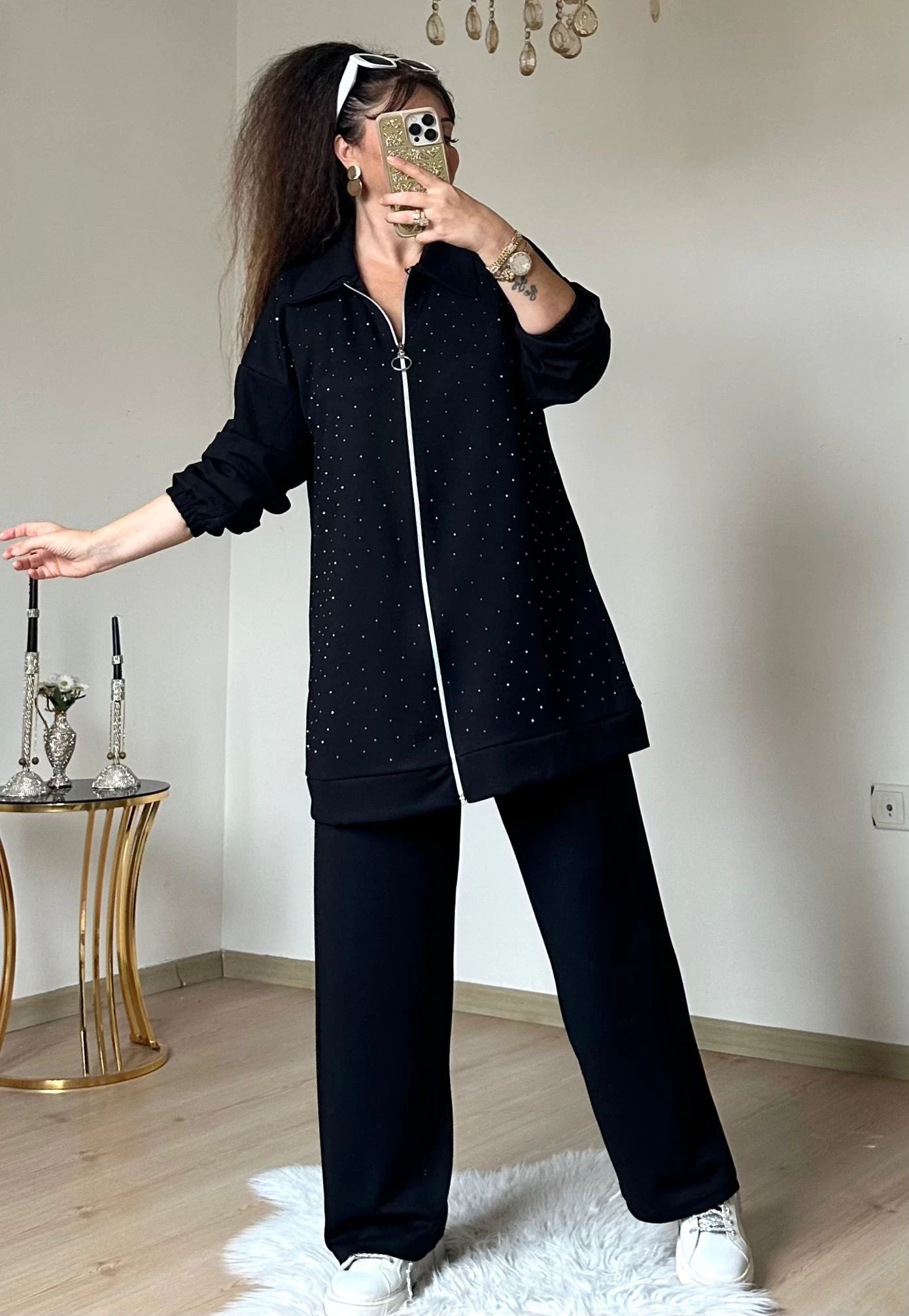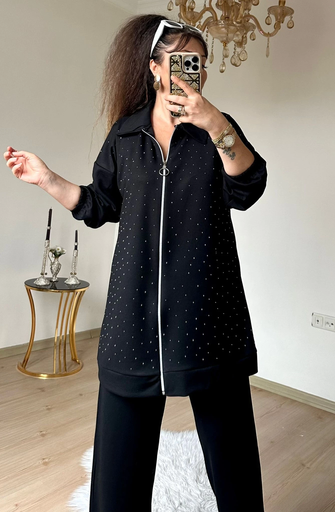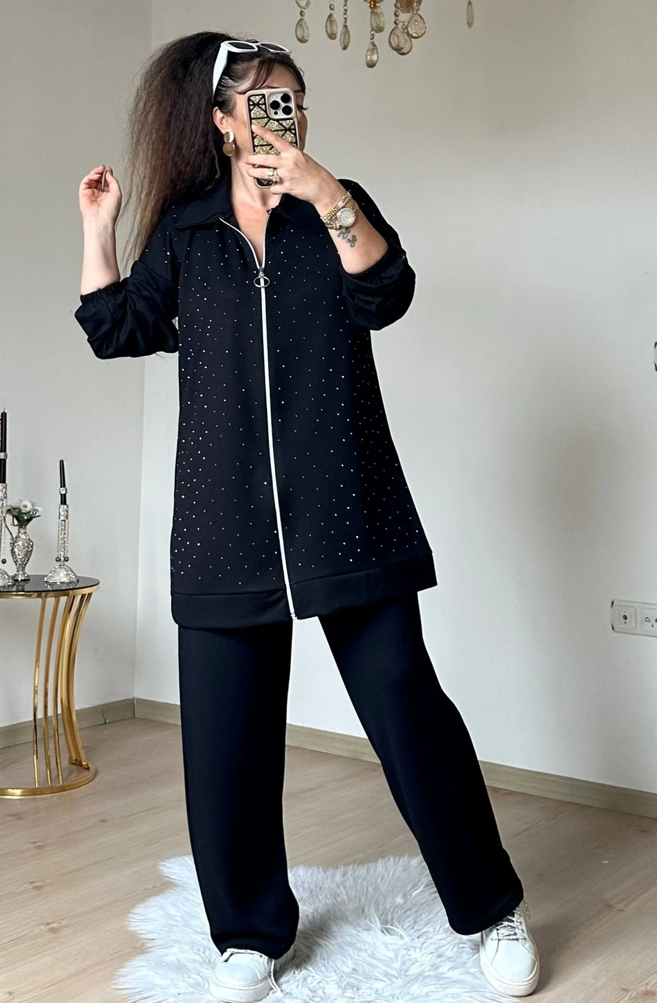 Fermuarlı Taşlı Takım Siyah Büyük Beden
