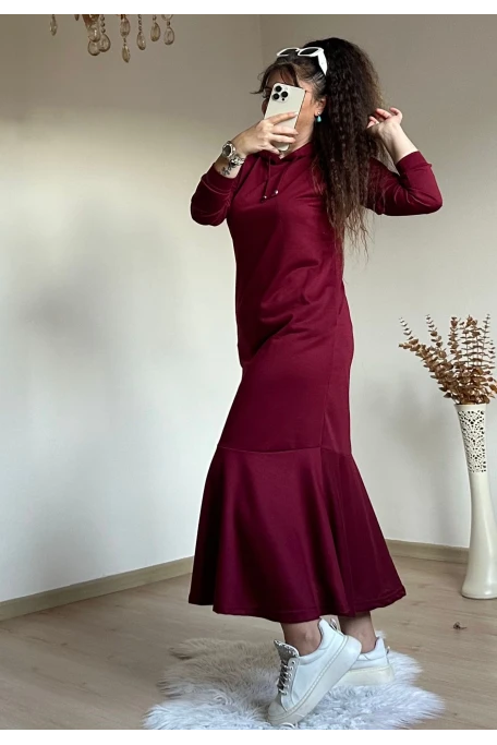 Kapusonlu Etek Fırfırlı Elbise Bordo