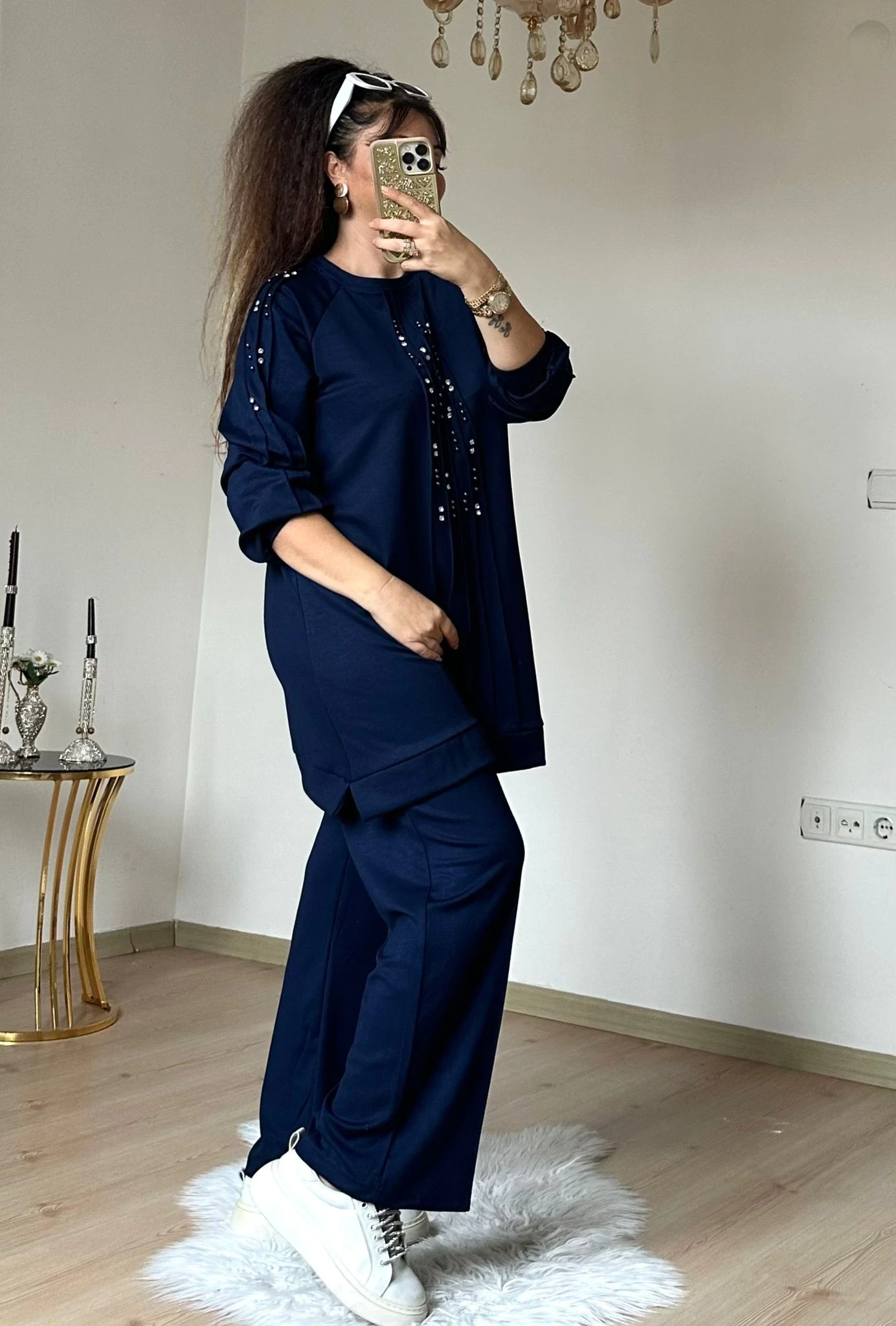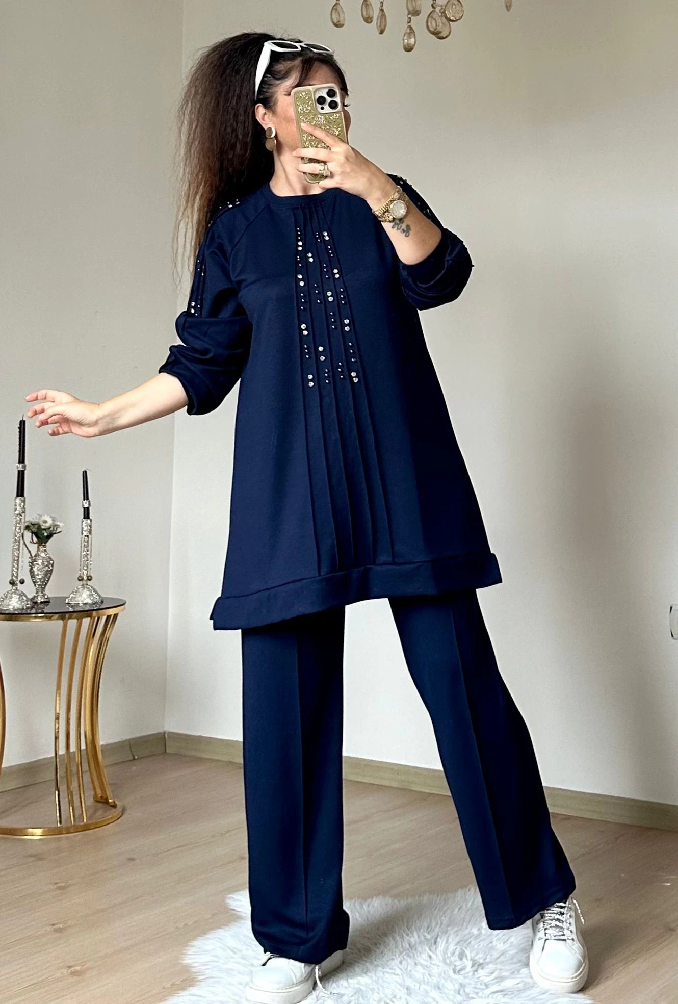 Fermuarlı Taşlı Takım Lacivert Büyük Beden