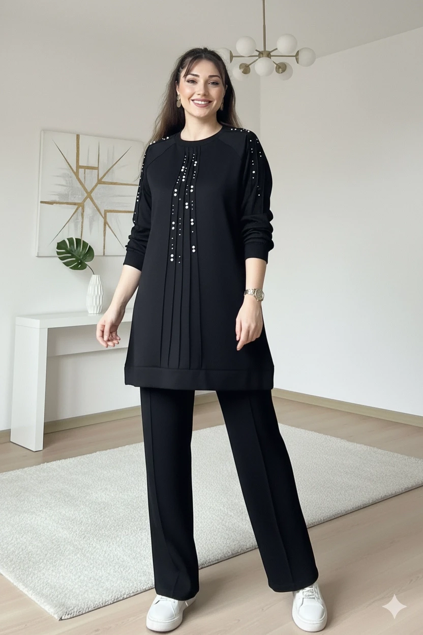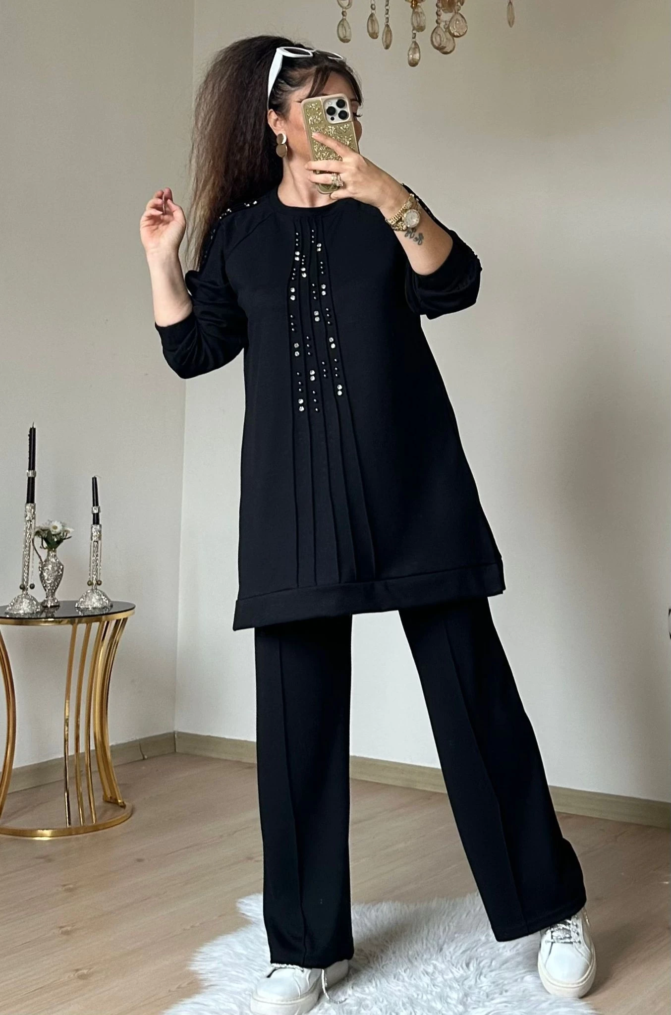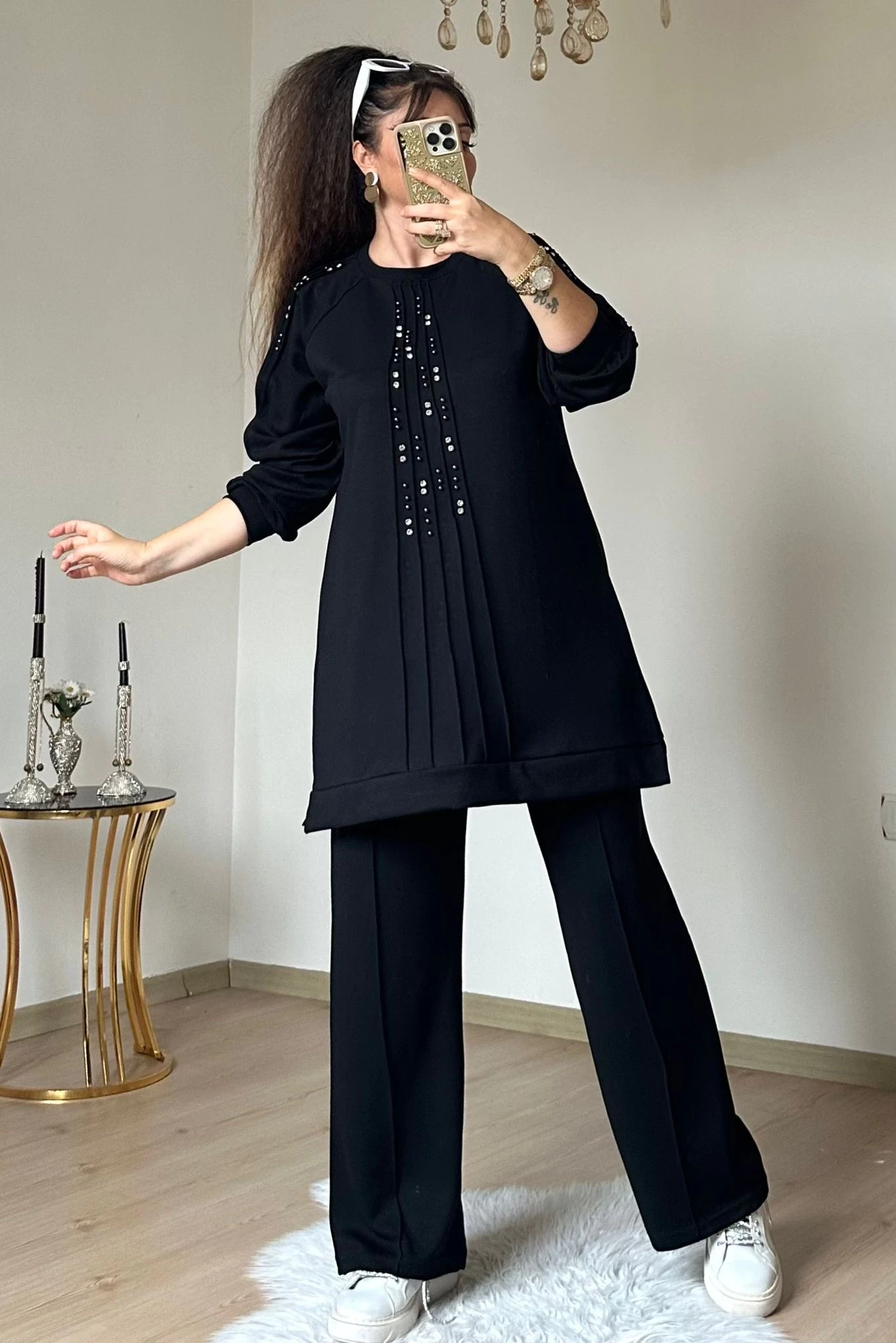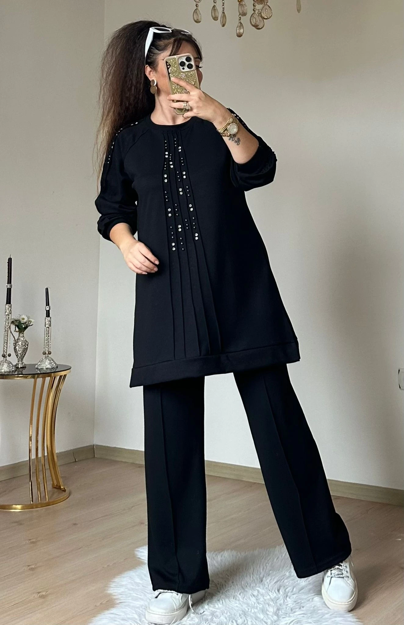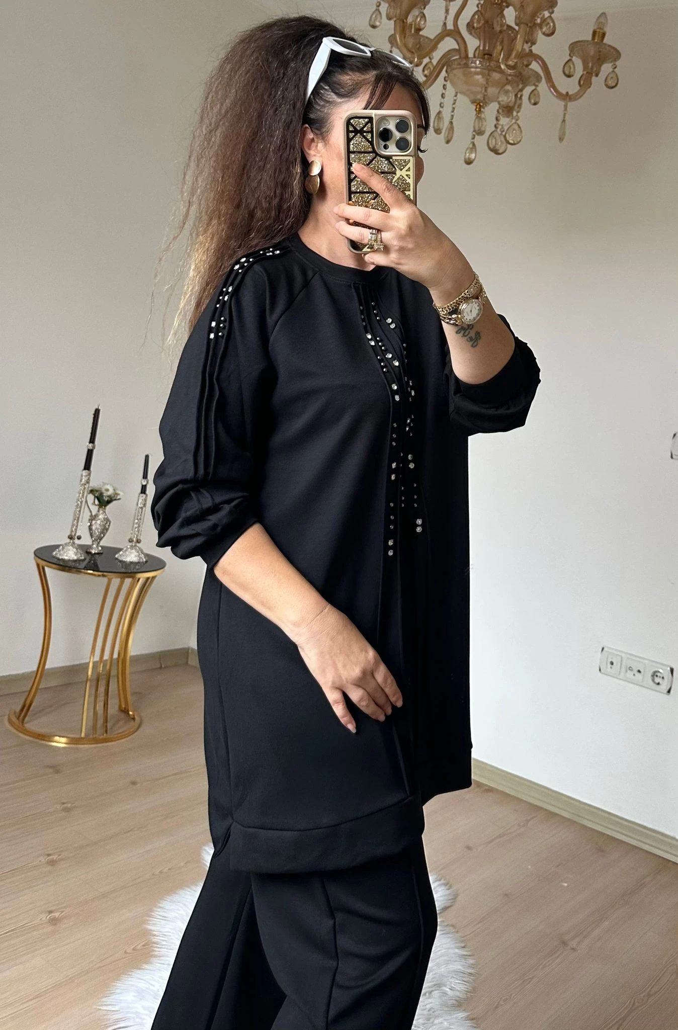 Ön Dikiş Detaylı Taşlı Takım Siyah Büyük Beden