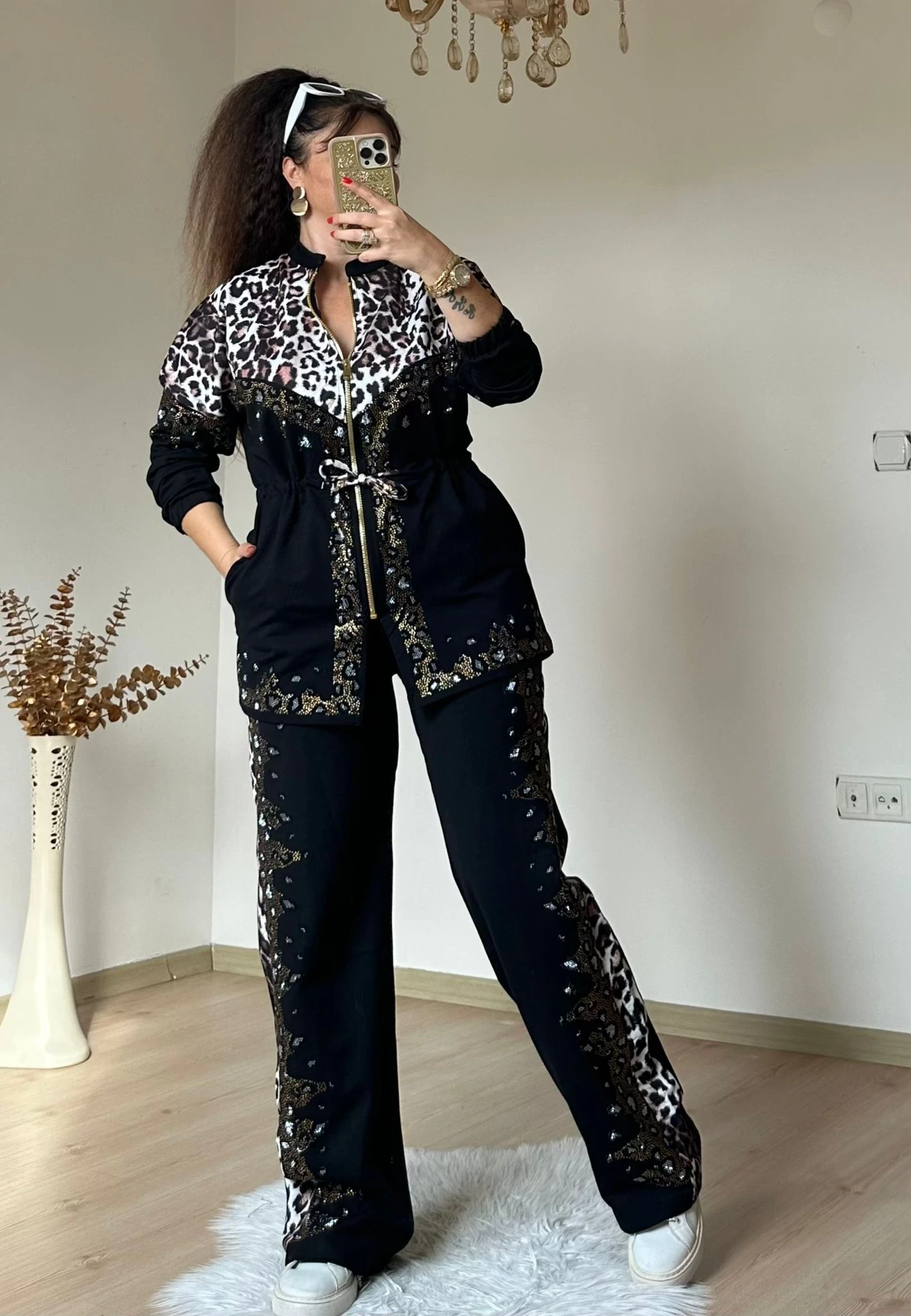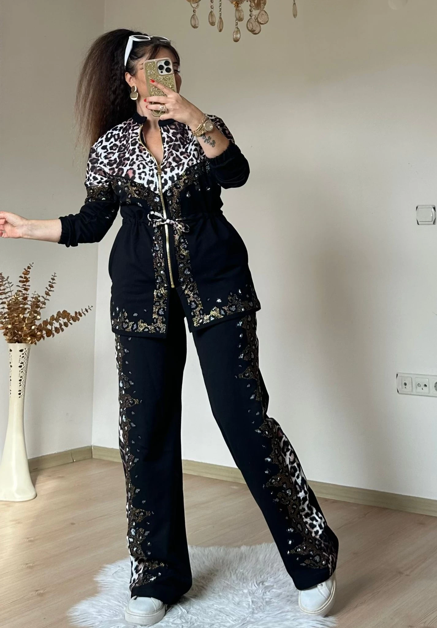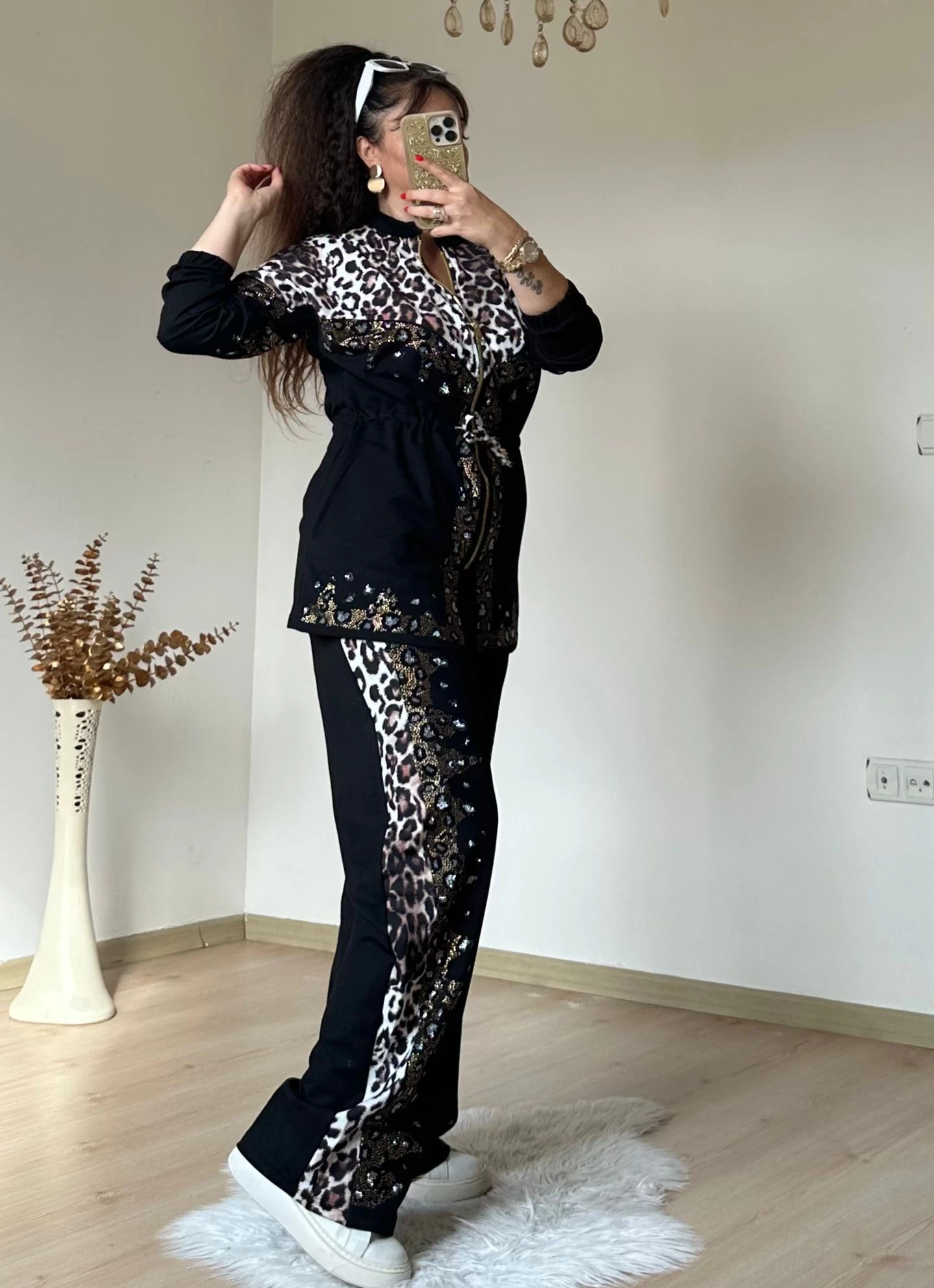 Deri Detaylı Leopar Eşofman Takımı