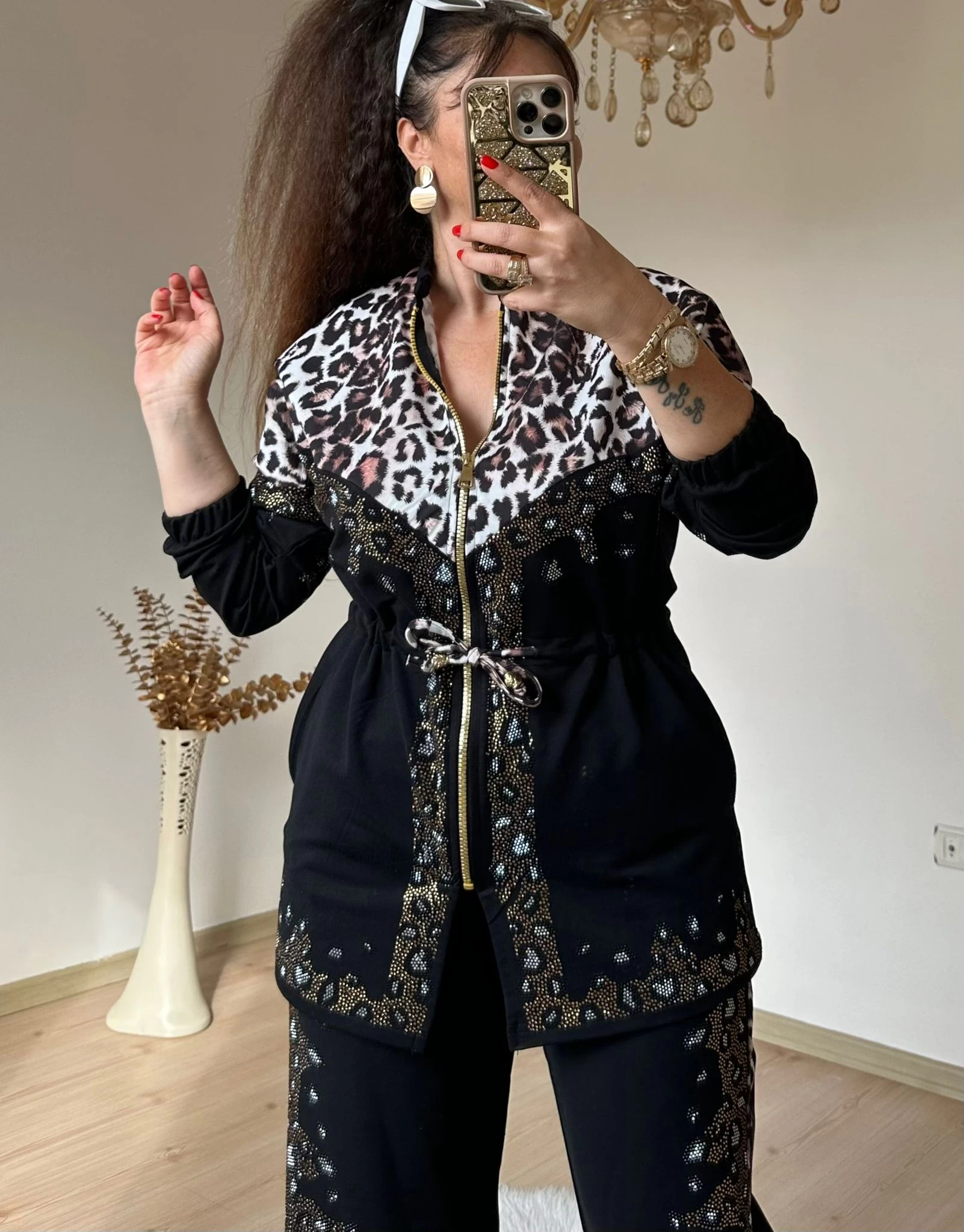 Ön Fermuarlı Taşlı Leopar Takım