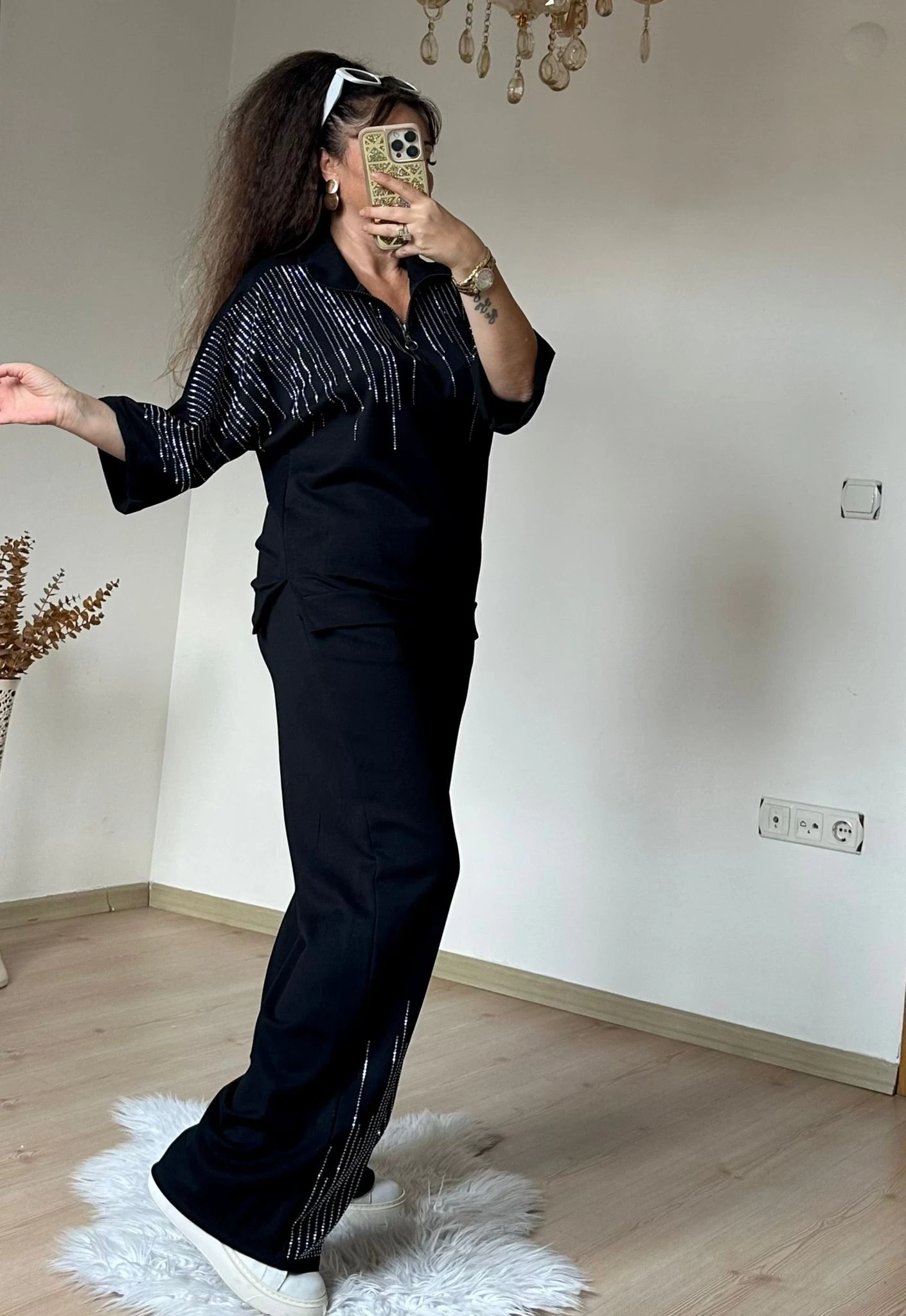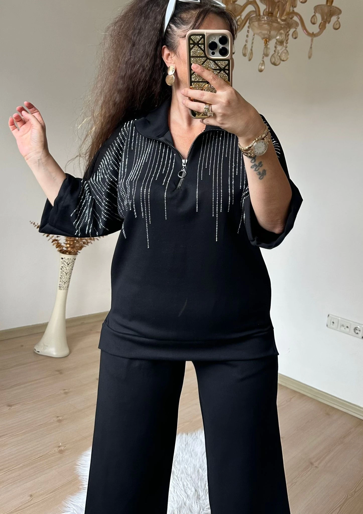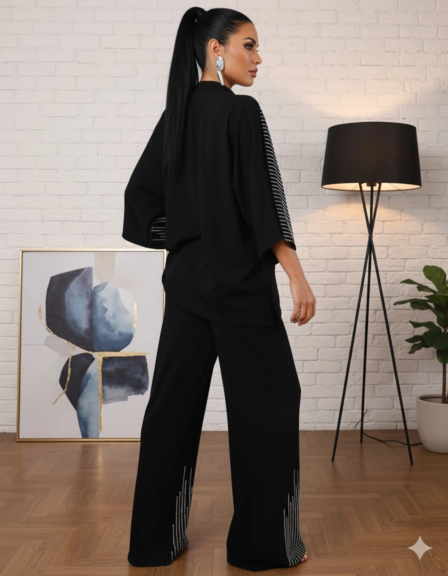 Ön Dikiş Detaylı Taşlı Takım Siyah Büyük Beden