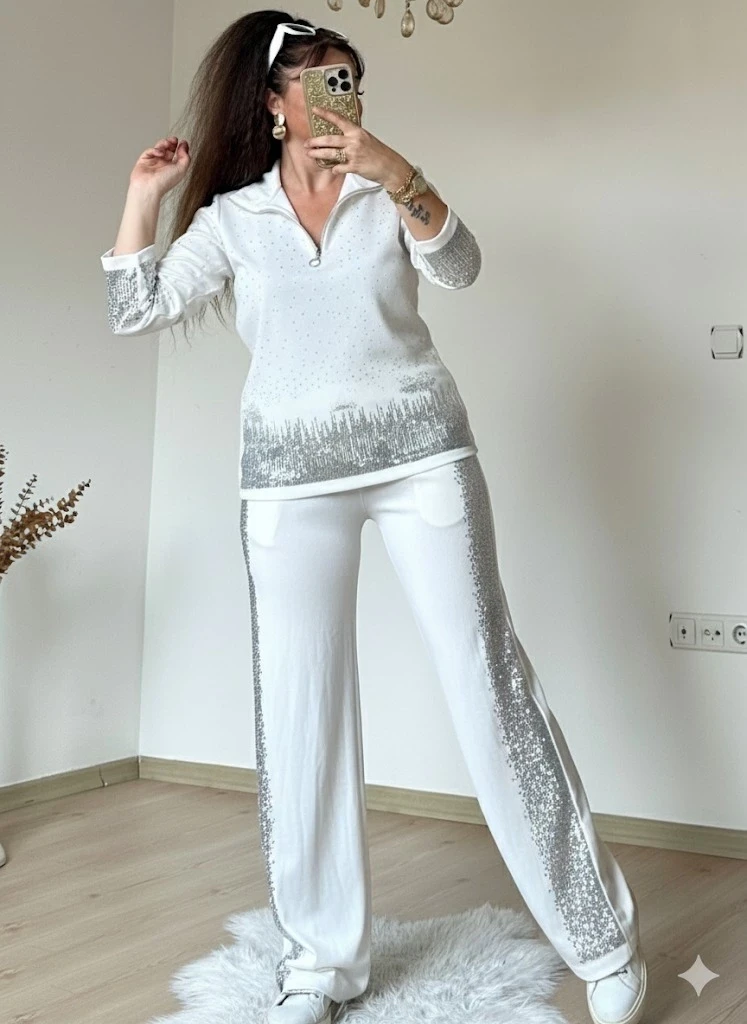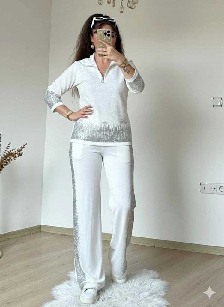 Ön Dikiş Detaylı Taşlı Takım Siyah Büyük Beden