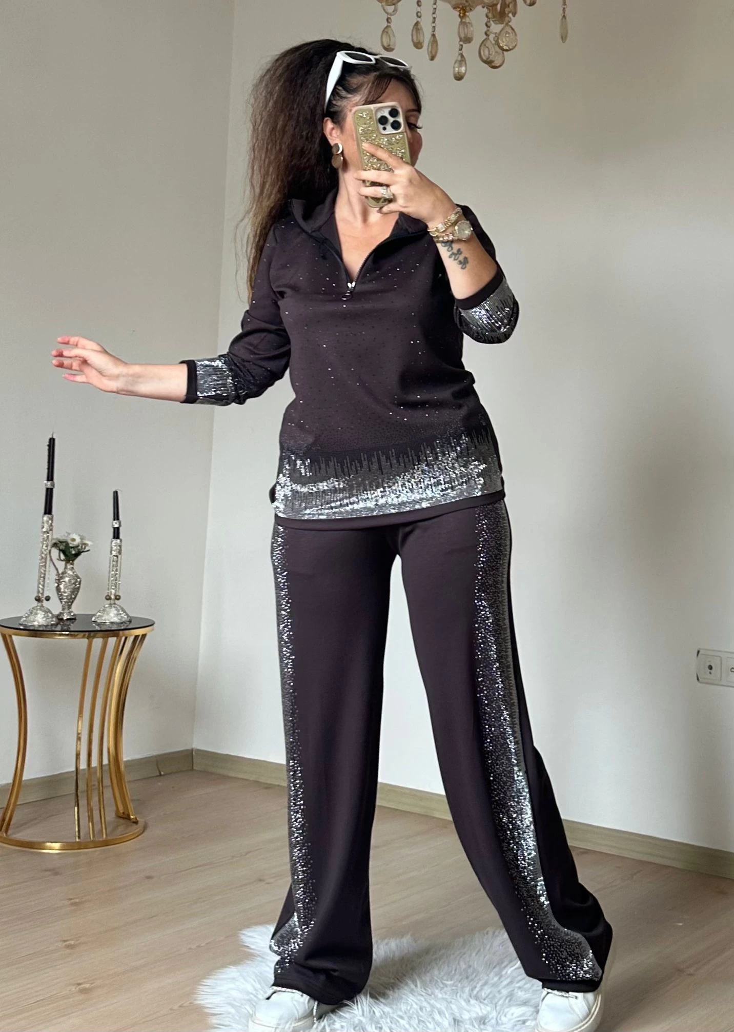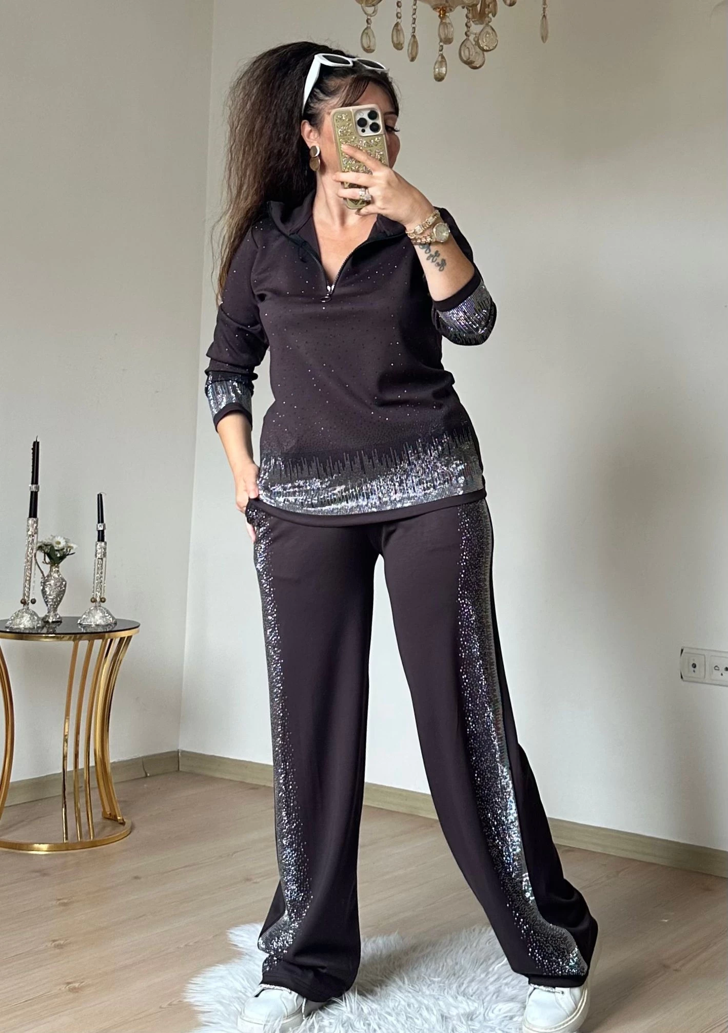 Ön Dikiş Detaylı Taşlı Takım Siyah Büyük Beden