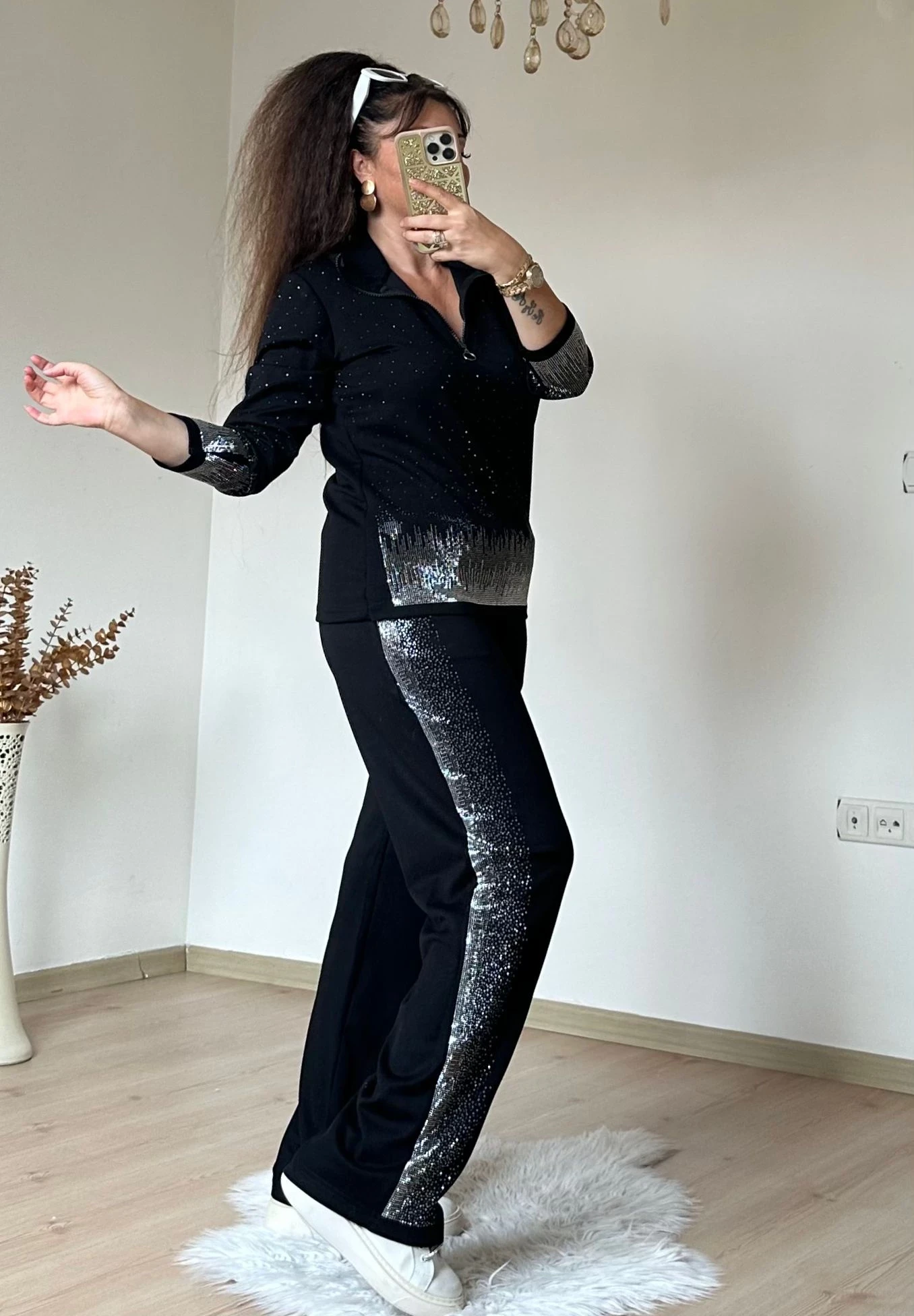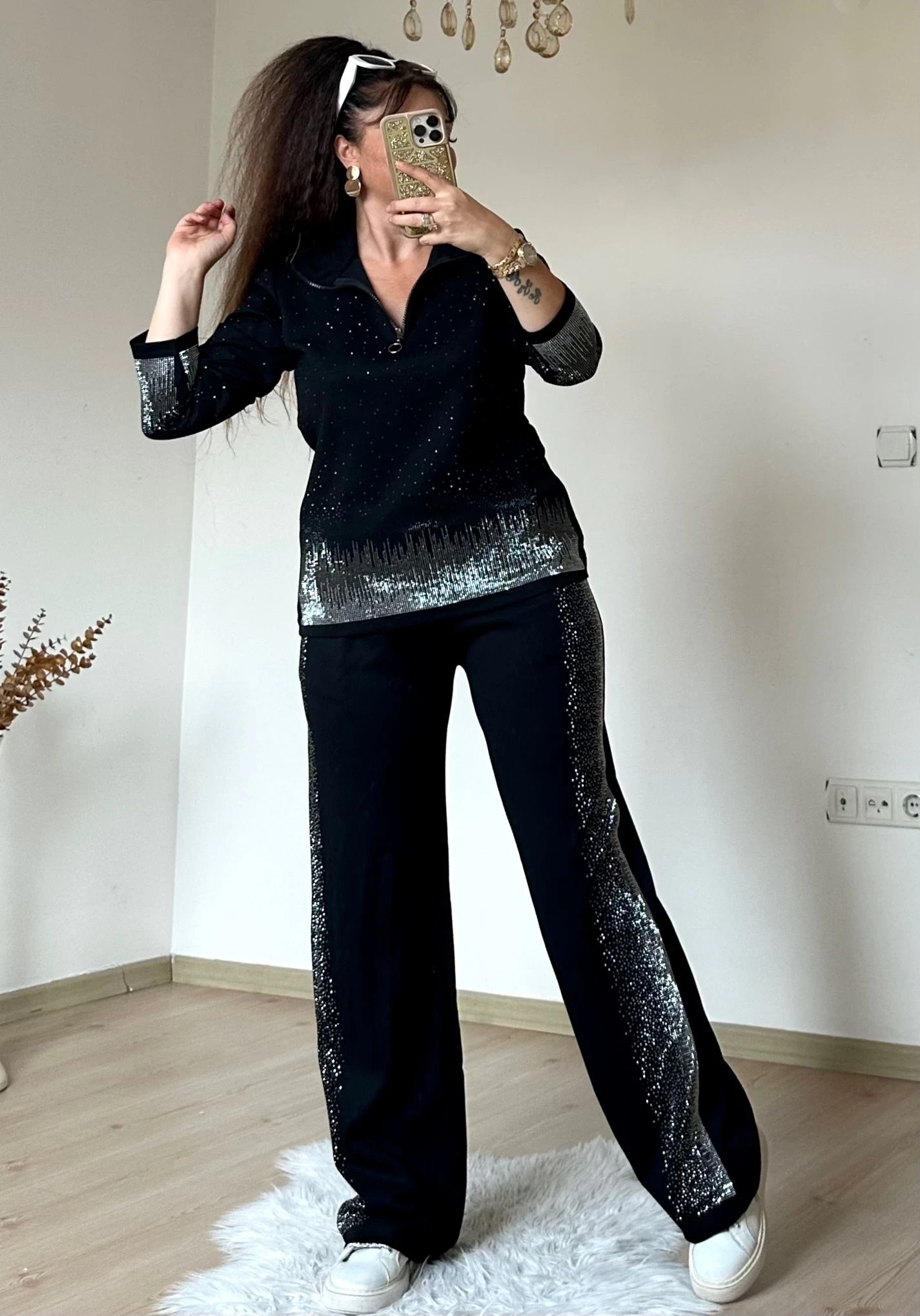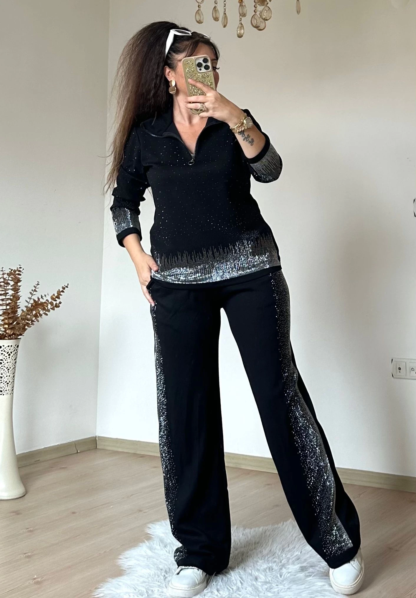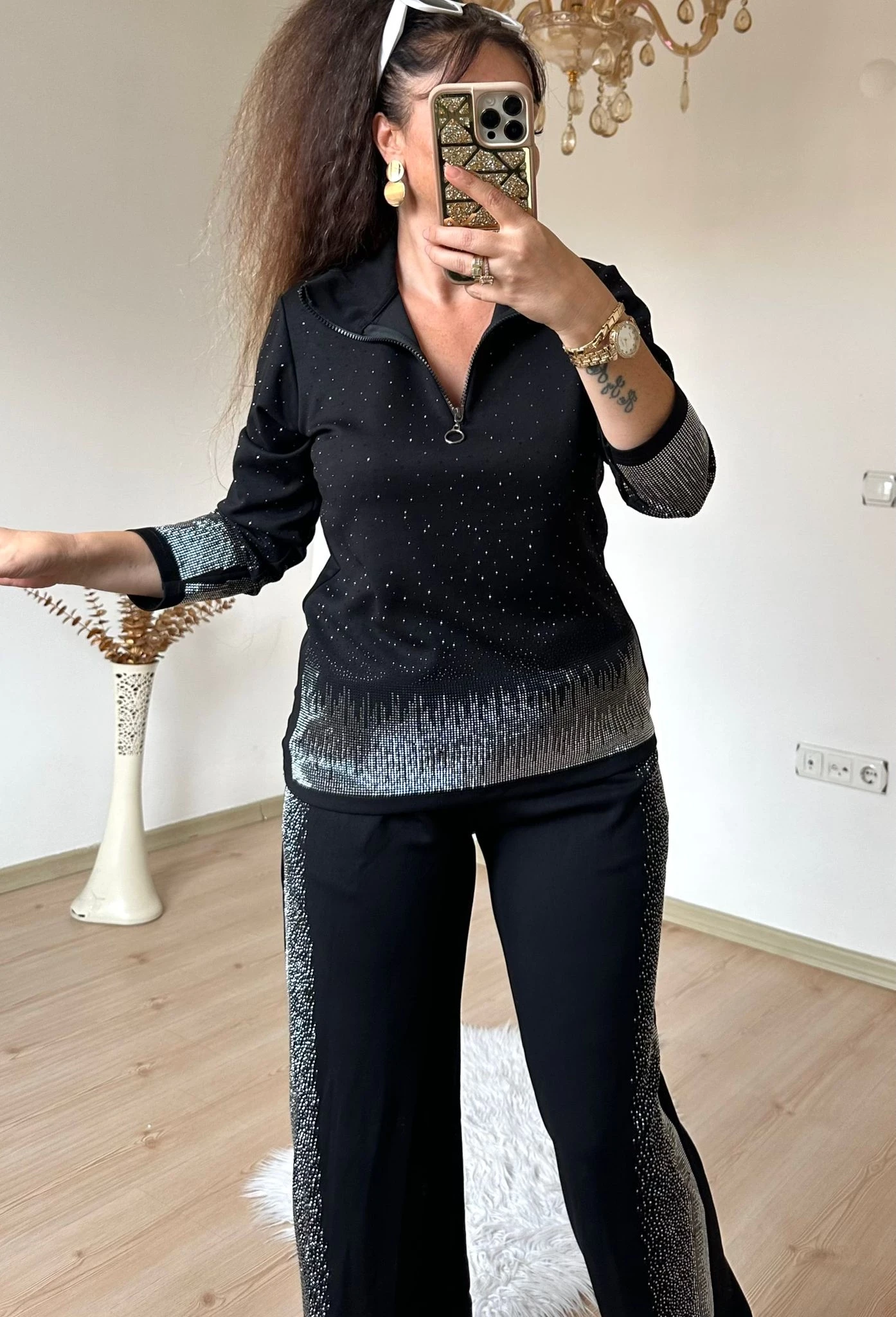 Ön Dikiş Detaylı Taşlı Takım Siyah Büyük Beden