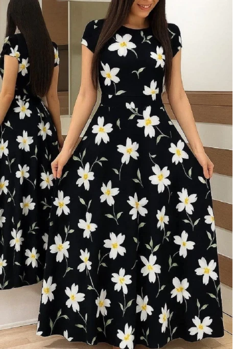 Kısa Kol Papatya Krep Elbise Siyah