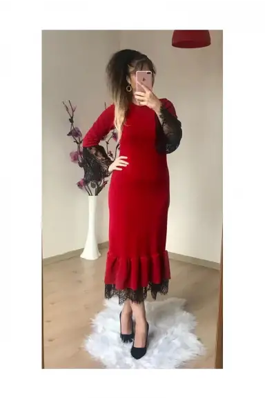 Kol ve Etek Ucu Dantelli Midi Boy Triko Elbise -KIRMIZI