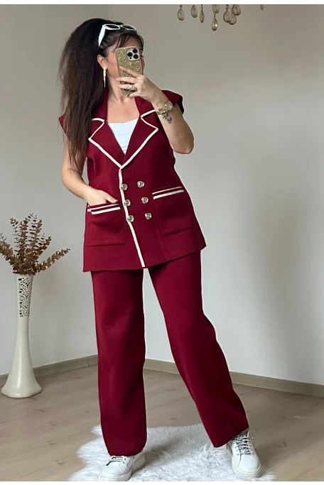 Gömlek Yaka Beyaz Şeritli Triko Takım Bordo