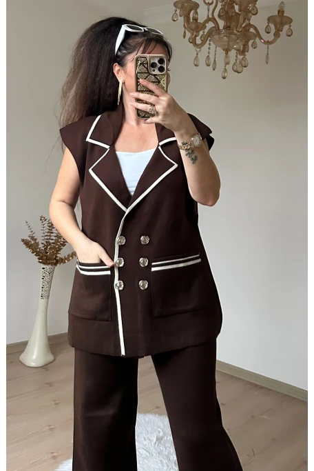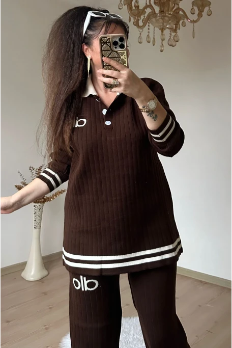 Gömlek Yaka Beyaz Şeritli Triko Takım Kahve
