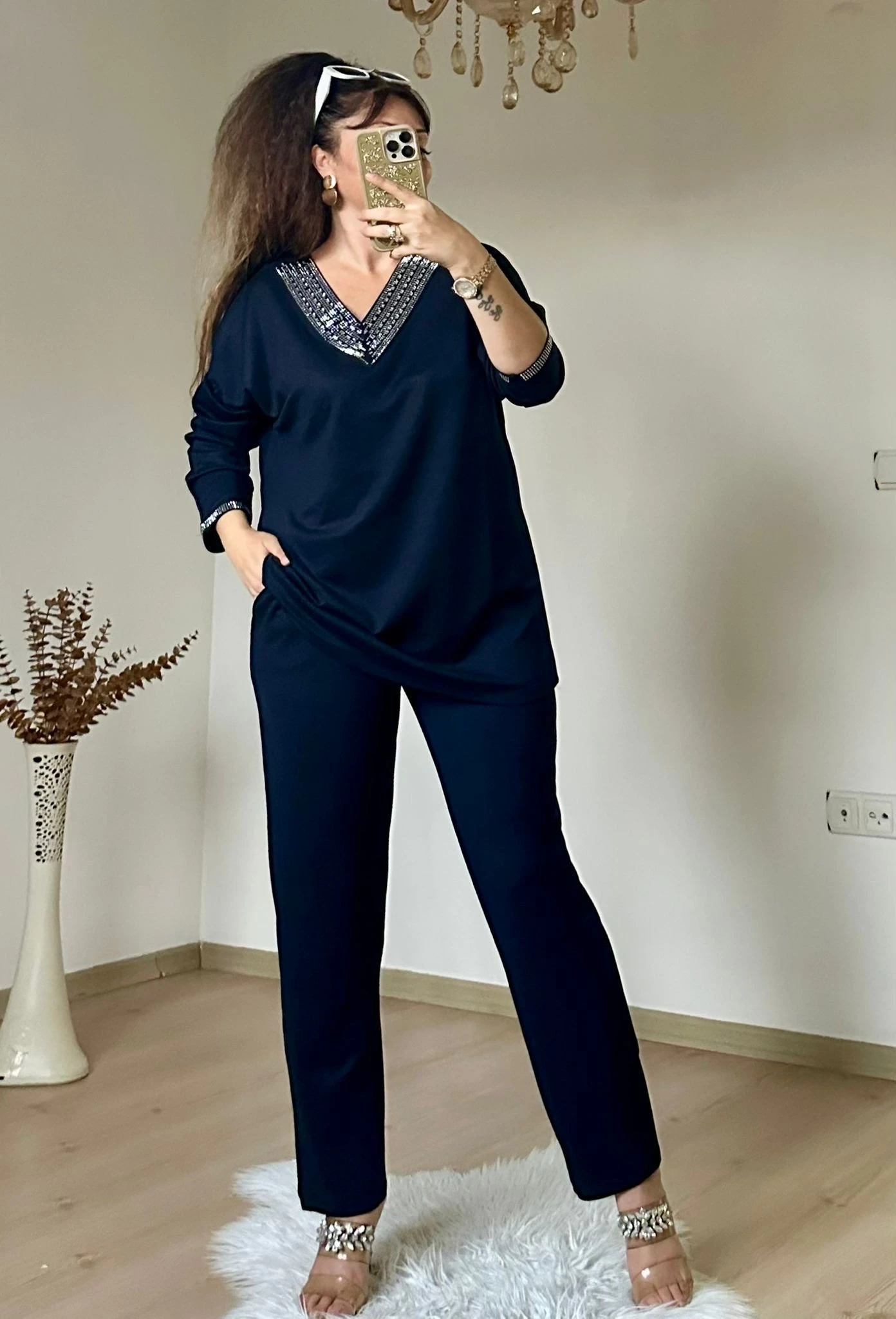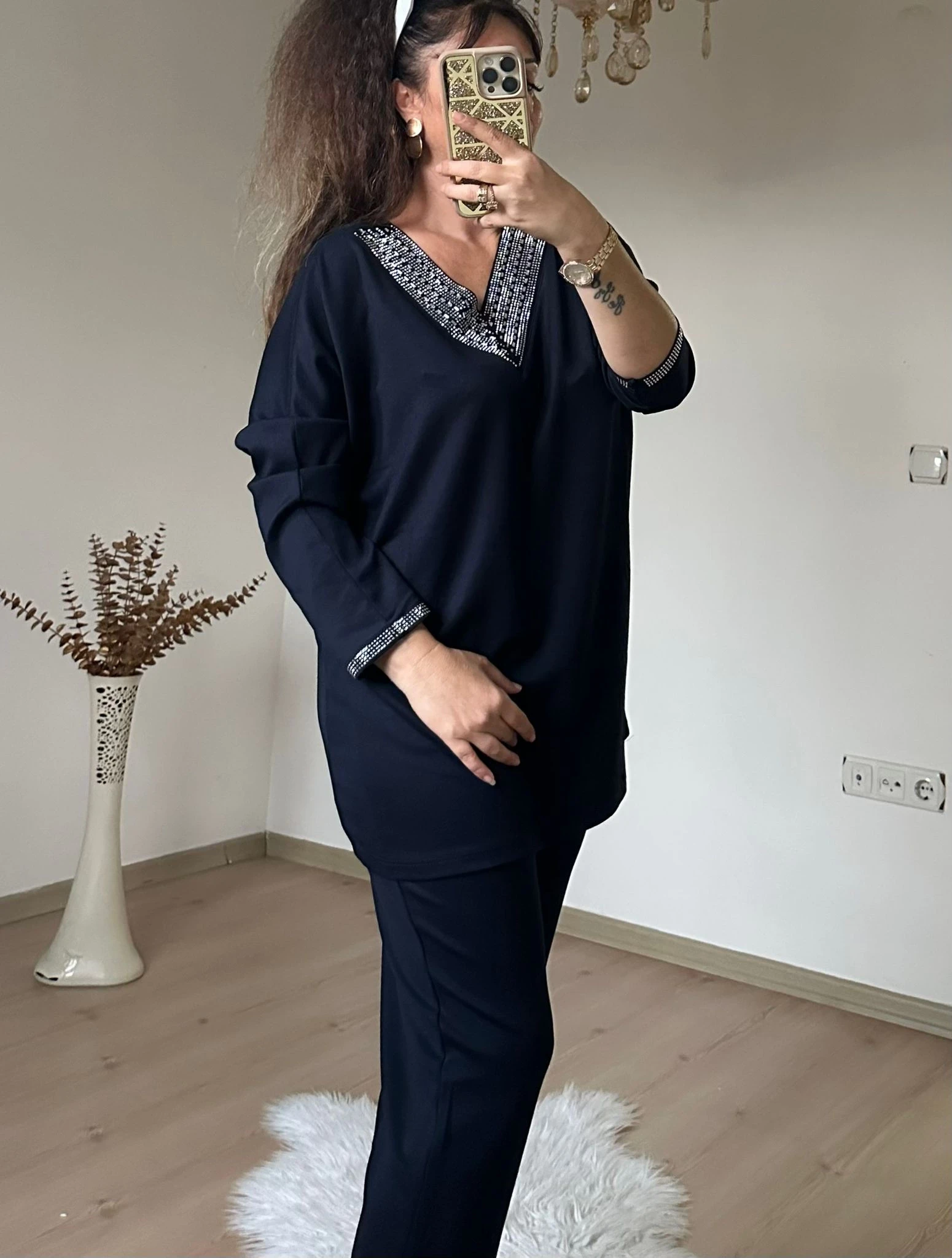 Ön Dikiş Detaylı Taşlı Takım Lacivert Büyük Beden