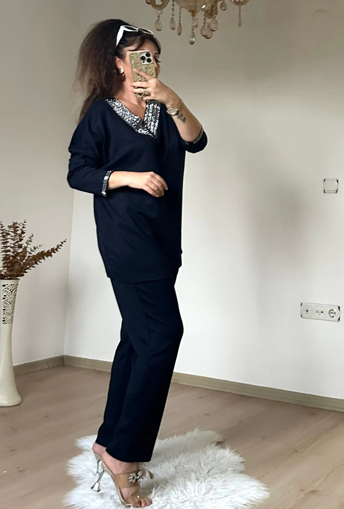 Ön Dikiş Detaylı Taşlı Takım Siyah Büyük Beden