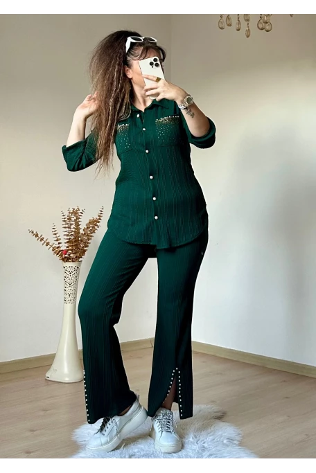 Yaka Taşlı Paça Detaylı Takım Zümrüt Yeşili