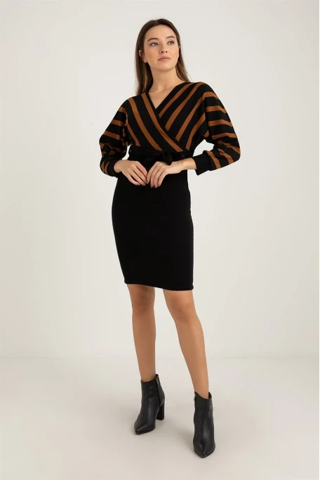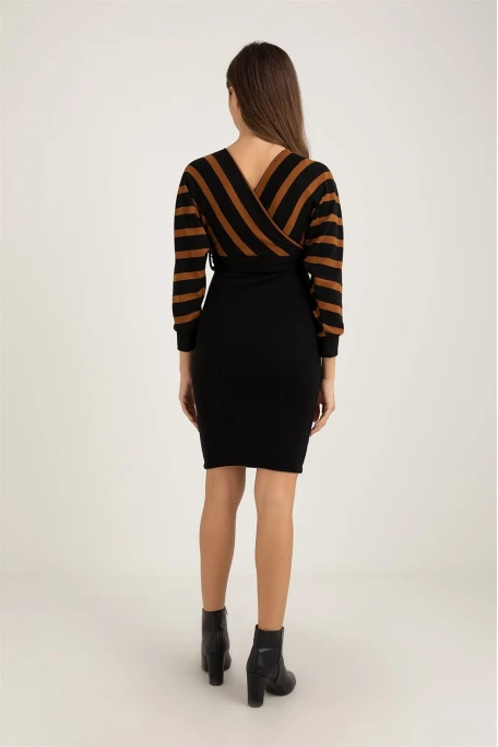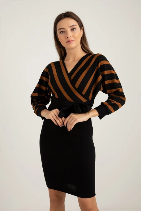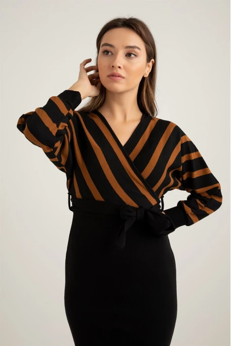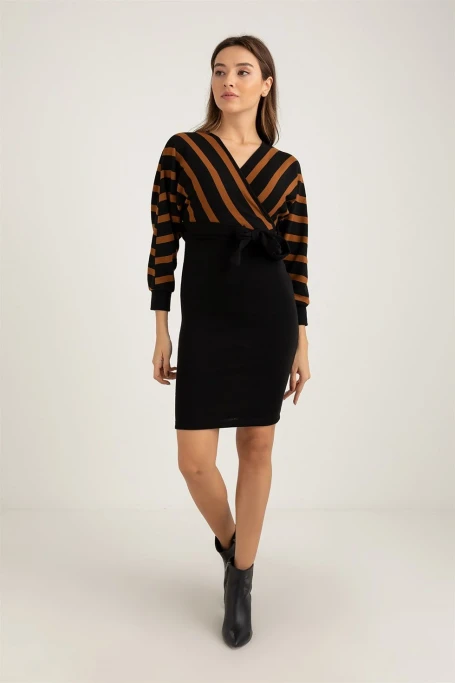 Üst Çizgili Alt Siyah Triko Elbise -KAHVE