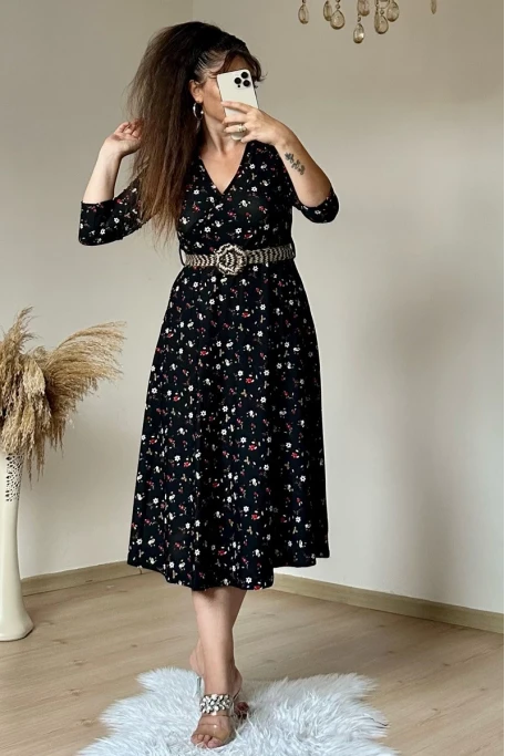 Kemerli Çıtır Çiçekli Krep Elbise Siyah