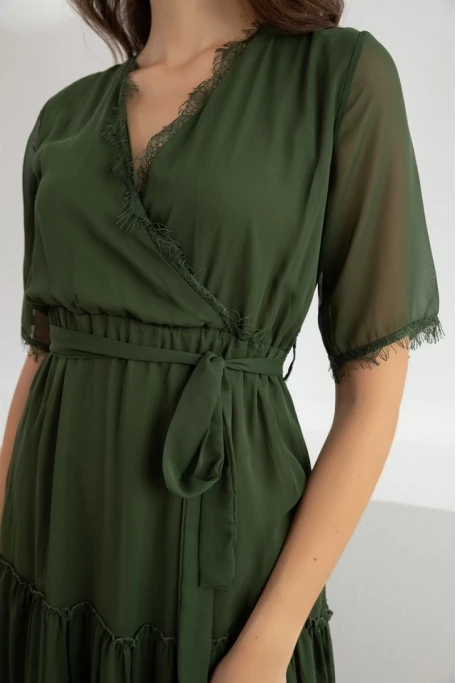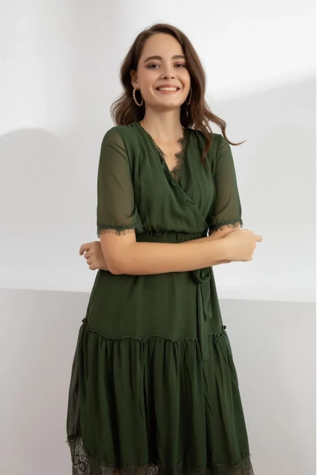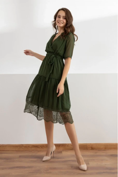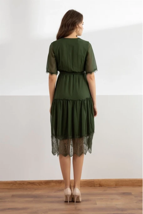 Dantel Detay Şifon ElbiseÜrünün uzunluğu 120 cm'dir. (1-3 cm arası değişiklik gösterebilir.)Ürünün kol uzunluğu 30 cm'dir. (1-3 cm arası değişiklik gösterebilir.)Modelin üzerindeki ürün S/36 bedendir.Modelin Ölçüleri: Boy: 1.75, Kilo: 52, Göğüs: 85, Bel: 63, Kalça: 95Kumaş Türü: ŞifonÜrün kuşaklı ve astarlı olarak tasarlanmıştır.